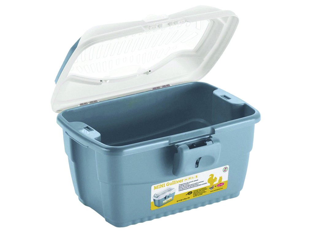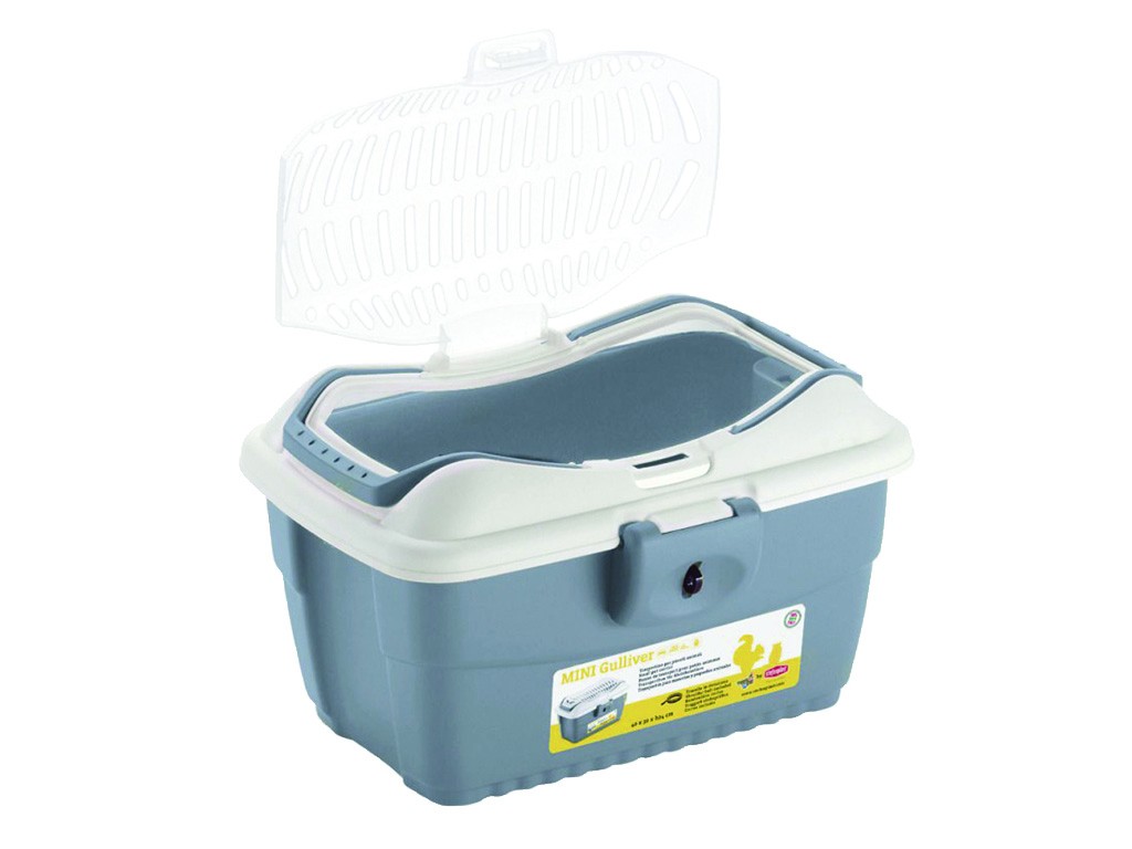 Dla chomików, królików, papug do 2,5 kg, podwójnie zawiasowana pokrywa, górna pokrywa z otworami wentylacyjnymi, dolna pokrywa z klipsem i blokadą bezpieczeństwa, podwójny uchwyt i pasek na ramię , wymiary wewnętrzne 31 x 23 x 23,5 cm, wymiary zewnętrzne 40 x 30 x 24 cm.