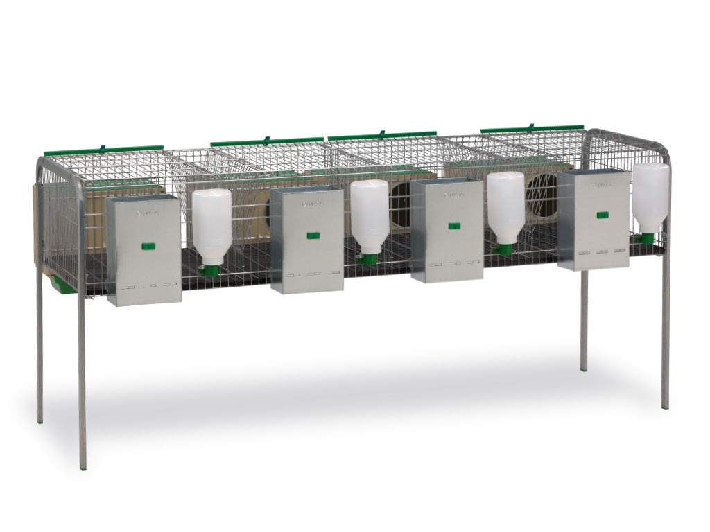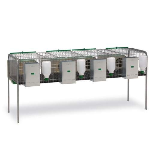 Klatka podzielona jest na 4 w pełni wyposażone boksy . Każdy boks zawiera dwustanowiskowy karmnik z podajnikiem ułatwiającym uzupełnianie karmy, poidło butelkowe oraz legowisko podwieszone na zewnątrz. Zarówno boks, jak i legowisko posiadają plastikową podłogę , którą można zdemontować i łatwo wyczyścić.