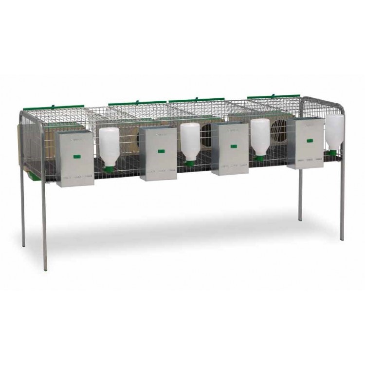 Klatka dla królików Silleda - system parterowy z czterema kojcami - z plastikową podłogą. 4 kojce są przeznaczone dla samic, w tym 4 plastikowe legowiska, dwustanowiskowe karmniki, koryto na siano i poidła butelkowe.