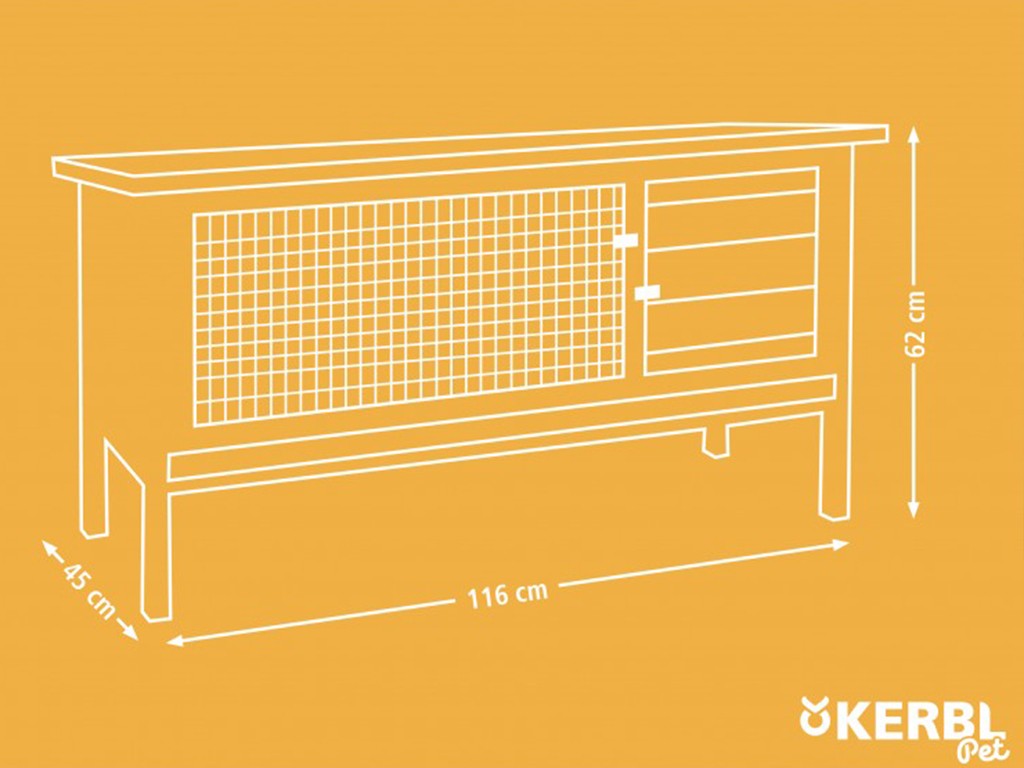 Wymiary zewnętrzne całej klatki dla królika wynoszą 116x45x62 cm , najmniejsza wysokość wewnętrzna kojca wynosi 40 cm , i w ten sposób zapewnia komfort pojedynczemu królikowi, królikowi karłowatemu, śwince morskiej lub innym małym gryzoniom.