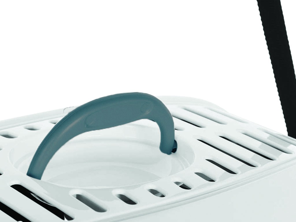 Dla łatwego przenoszenia, na górze klatki znajduje się praktyczny uchwyt i pasek na ramię. Praktyczne okienka z daszkami w pokrywie i po bokach klatki zapewniają odpowiednią cyrkulację powietrza.
