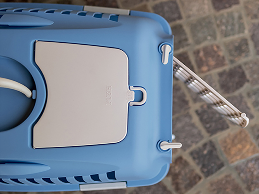 Dla ułatwienia przenoszenia, na górze klatki znajduje się praktyczny uchwyt. Dla jeszcze większego komfortu, klatka posiada dwa uchwyty na górze do mocowania pasów (brak w zestawie). Kratka w drzwiach i praktyczne okienka z daszkami po bokach klatki zapewniają odpowiednią cyrkulację powietrza.