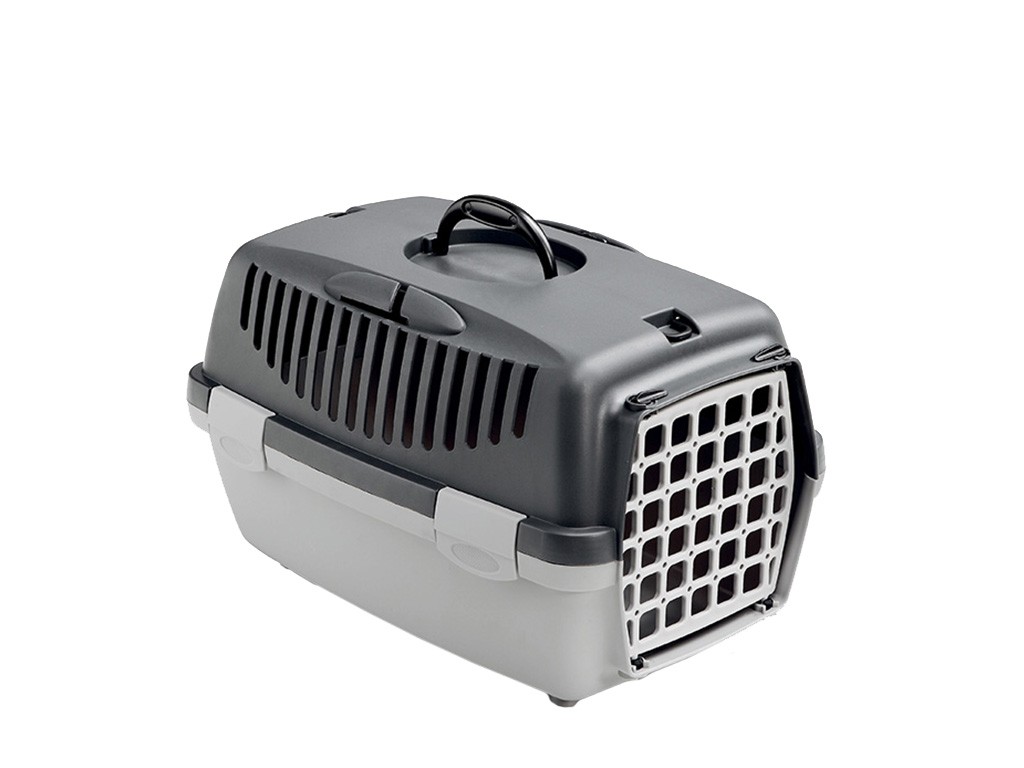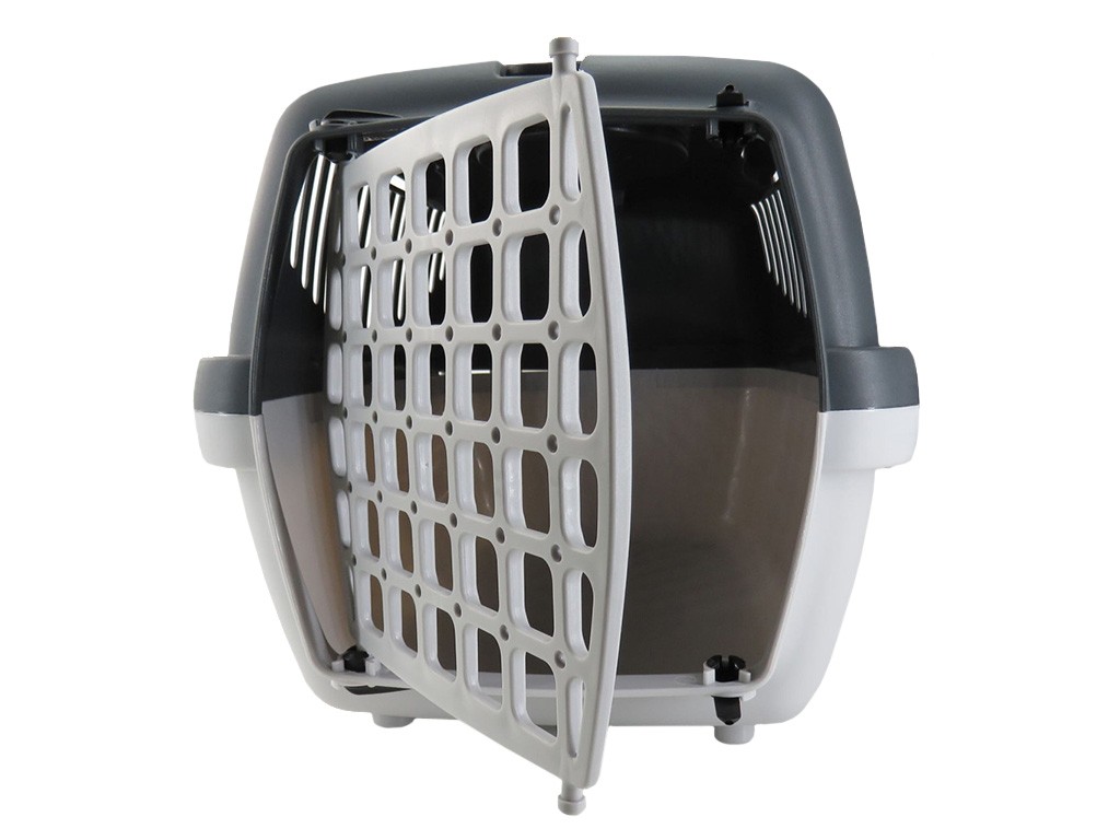 Dla psów i kotów o wadze do 6 kg, pokrywa i pojemnik połączone klipsami, przednie drzwi z 4 zamkami, regulowane otwieranie drzwi z prawej lub lewej strony , uchwyt ułatwiający przenoszenie klatki, dwa uchwyty na pasy bezpieczeństwa w samochodzie , wymiary wewnętrzne 45x29x26,5 cm, wymiary zewnętrzne 48x32x31 cm.
