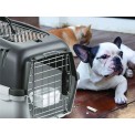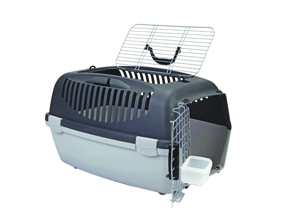 Dla psów i kotów o wadze do 10-12 kg, pokrywa i pojemnik połączone klipsami, metalowe przednie drzwi z blokadą, regulowane otwieranie drzwi z prawej lub lewej strony , uchwyt ułatwiający przenoszenie klatki, otwierana kratka na górze ułatwiająca kontakt ze zwierzęciem, dwa uchwyty na pasy samochodowe, miska o pojemności 500 ml z krawędziami zapobiegającymi rozlewaniu, wymiary wewnętrzne 58,5 x 36,5 x 33,5 cm, wymiary zewnętrzne 61 x 40 x 38 cm.