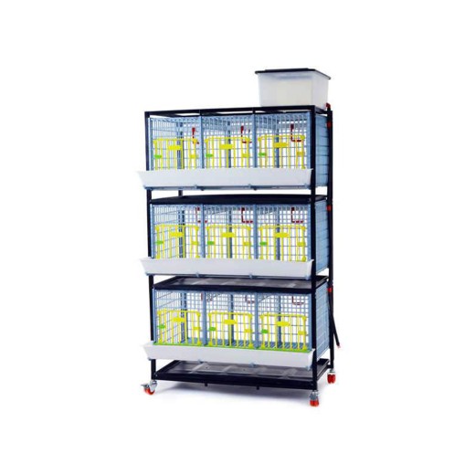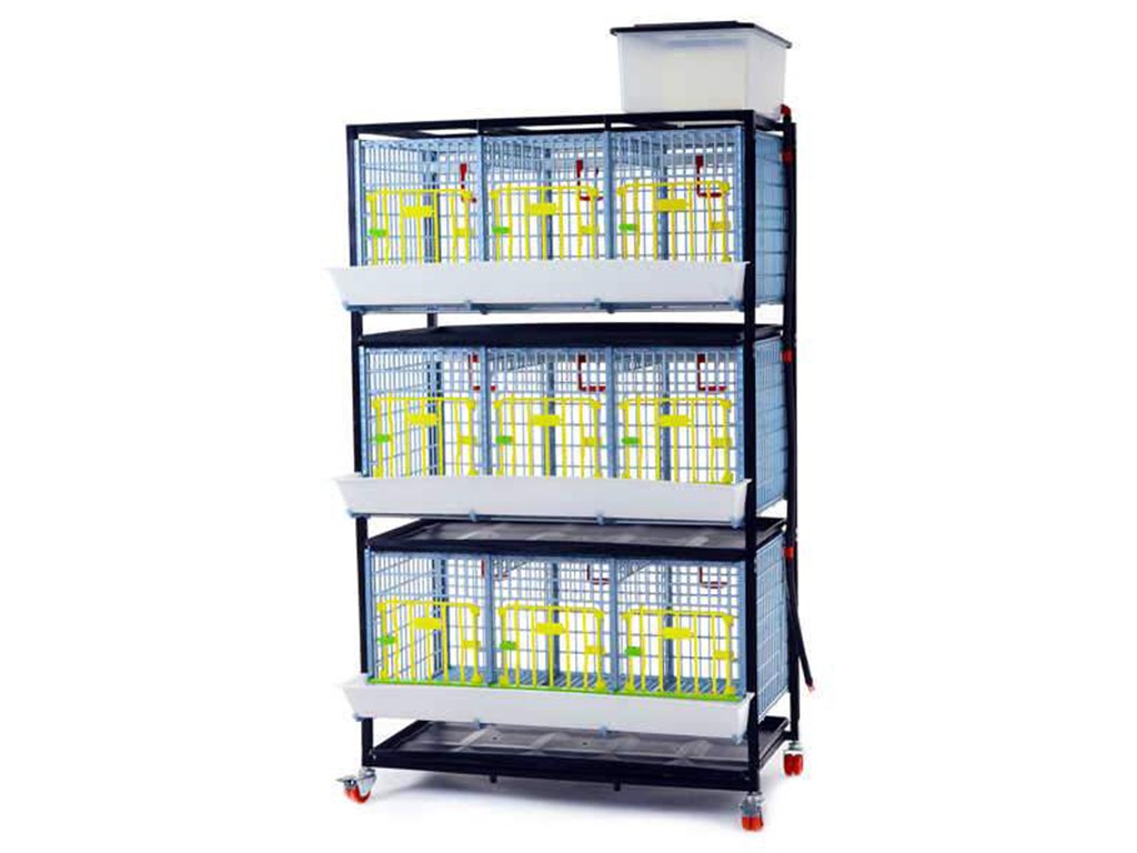 Klatka do hodowli kurczaków, przepiórek i innego drobiu o wymiarach 98 x 60 x 173 cm. Jest to klatka 3-poziomowa , wyposażona w karmnik z kratką zapobiegającą marnowaniu paszy oraz poidło z dopływem wody z 20-litrowego zbiornika . Klatki wykonane są z tworzywa sztucznego o wysokiej odporności na odchody i bakterie, co zapewnia bardzo łatwą konserwację klatki i usuwanie odchodów. Możliwość rozbudowy o kolejne piętro (maks. 4 poziomy), łatwa w transporcie dzięki kółkom z hamulcami.