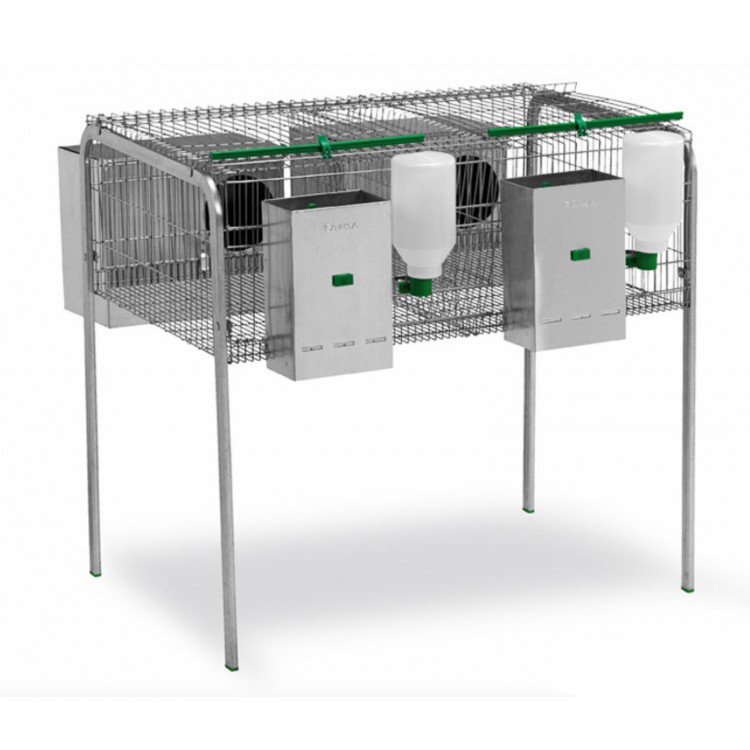 Metalowy kojec wyposażony jest w automatyczne karmniki, koryta, poidła i legowiska GAUN z tyłu.