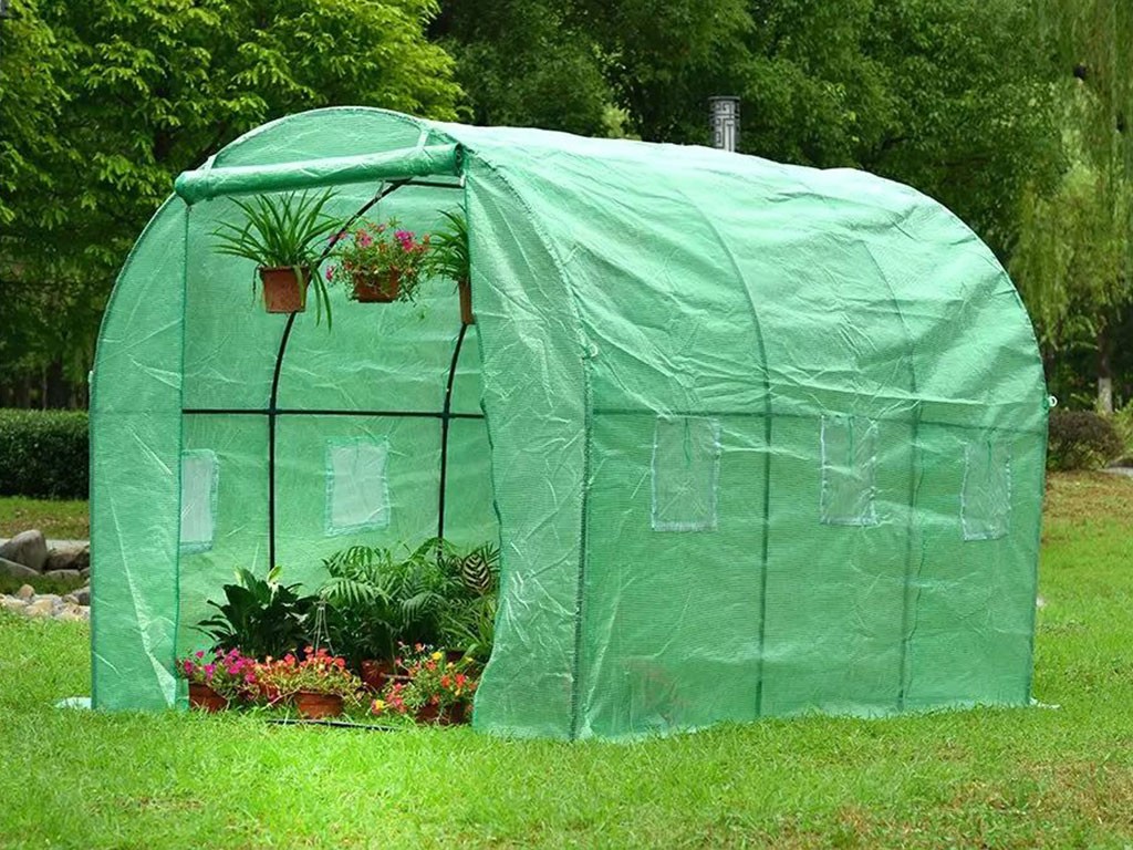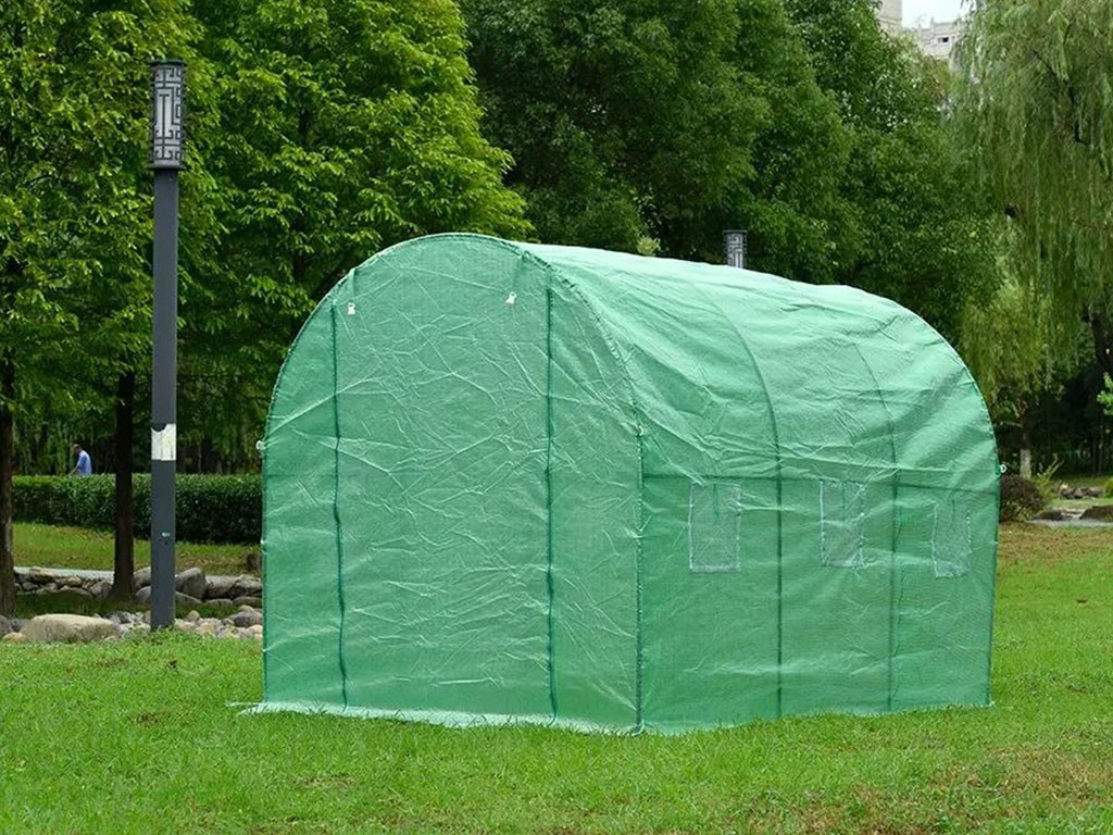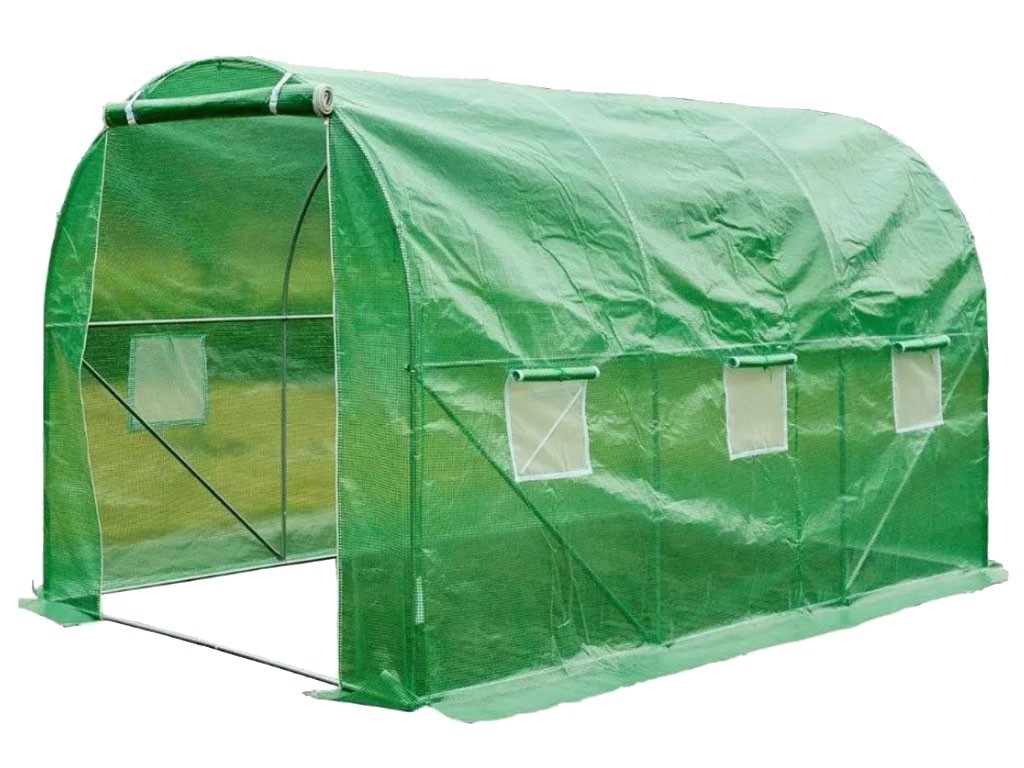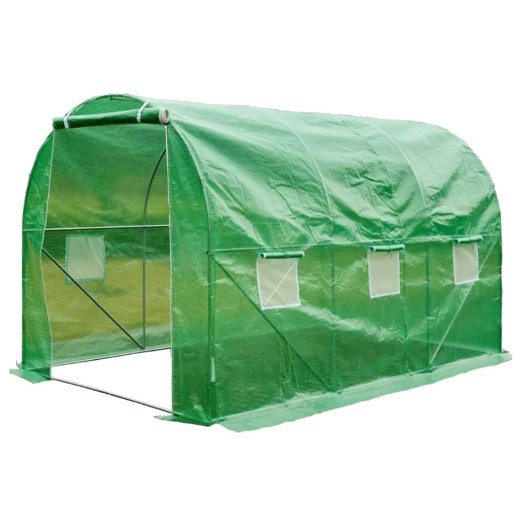 Szklarnia foliowa do uprawy roślin, zielona folia o przepuszczalności 140g/m2, włókno szklane/polietylen/metal, pręty konstrukcyjne o średnicy 25mm, 6 okien wentylacyjnych po bokach, powierzchnia szklarni foliowej 6 m2, wymiary 300x200x200 cm.