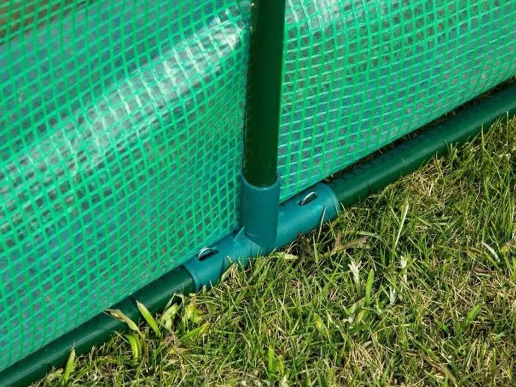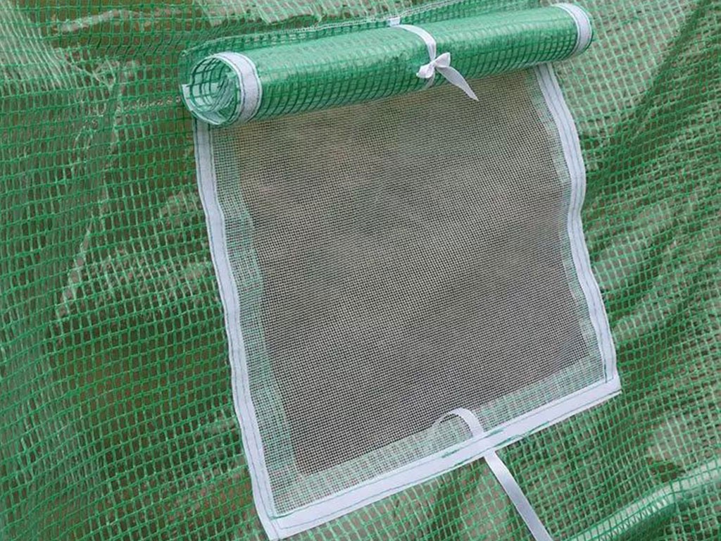 Praktyczna , zielona plandeka szklarni wykonana jest z płótna polietylenowego z włóknem szklanym o przepuszczalności 140 g/m². Konstrukcja szklarni składa się z metalowych prętów o średnicy 25 mm. Montaż jest niezwykle prosty i szybki – elementy konstrukcji łączą się ze sobą za pomocą zatrzasków, plandeka jest naciągana i mocowana do niej, a cała szklarnia jest zakotwiczona do podłoża. Aby zapewnić wentylację, szklarnia posiada 6 okien wentylacyjnych , które można w razie potrzeby zamykać lub otwierać, zawiązywanych sznurowadłami. Przestronne drzwi do szklarni można zwinąć i zawiązać u góry sznurowadłami.
