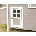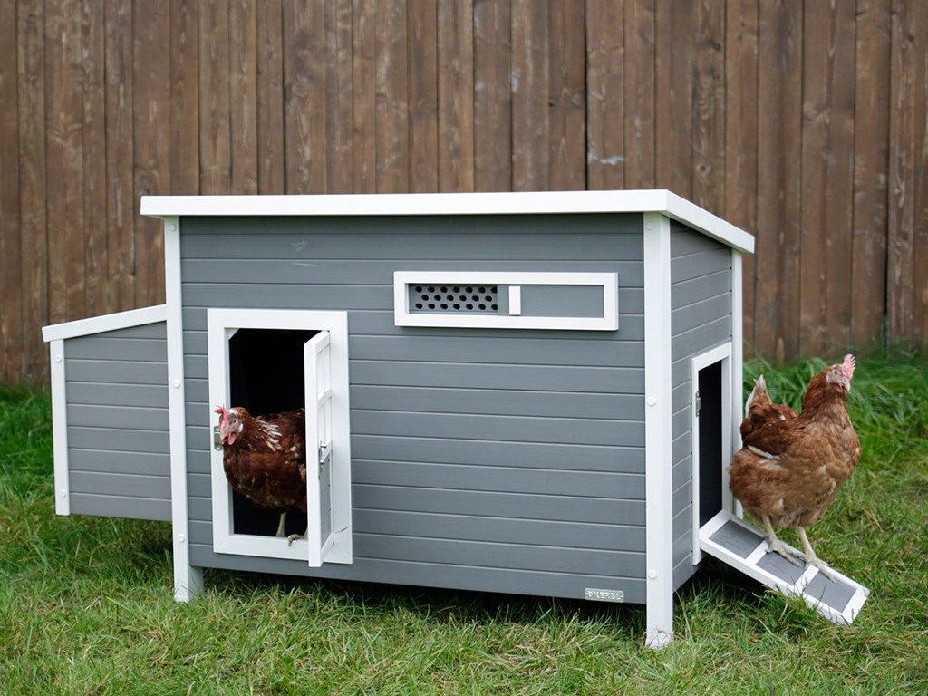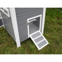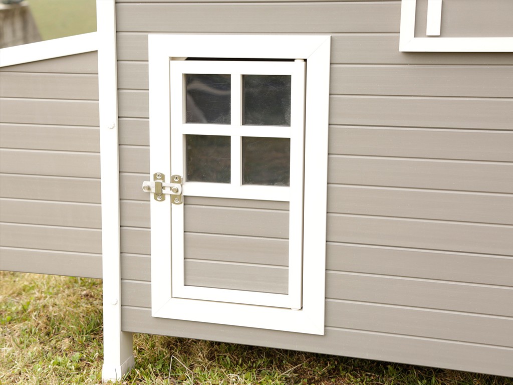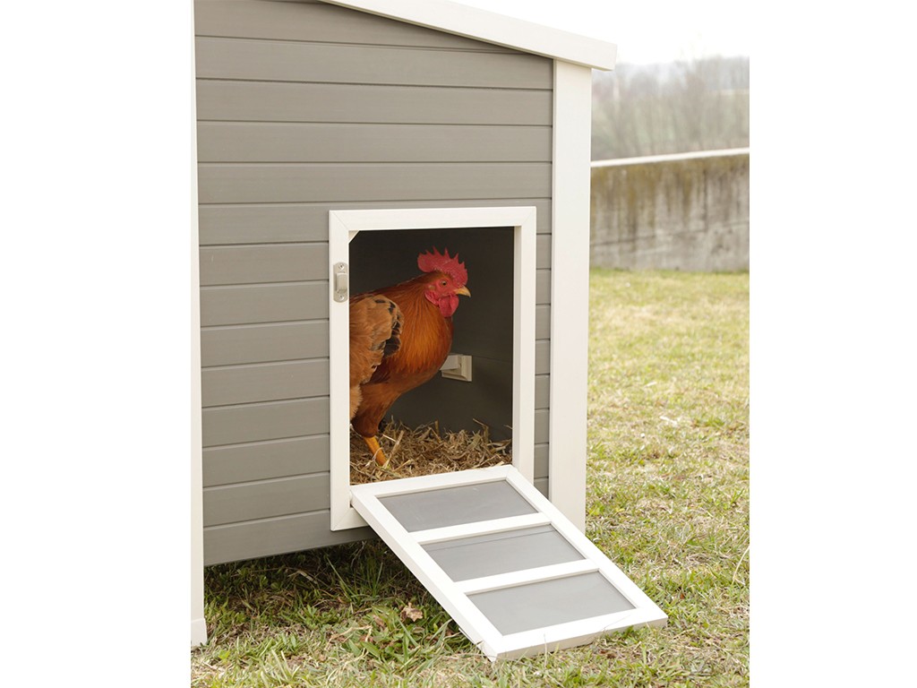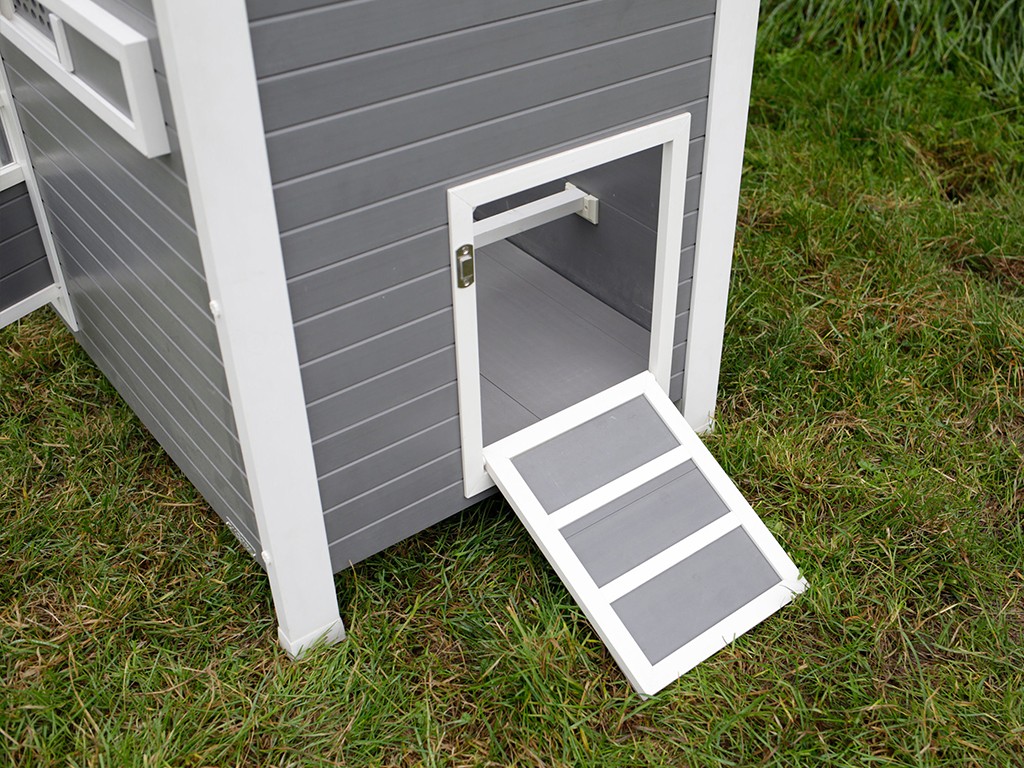 Dla łatwego dostępu, kurnik wyposażony jest w dwoje drzwi . Jedne drzwi z zatrzaskiem znajdują się z przodu kurnika i służą do łatwej wymiany wody, karmienia i wygodnego dostępu do kurnika. Z boku kurnik posiada również drzwi na zawiasach , które umożliwiają kurom swobodne wyjście z ogrodu lub bieganie . Drzwi zamykane są na zatrzask, co uniemożliwia ich otwarcie przez drapieżniki.
