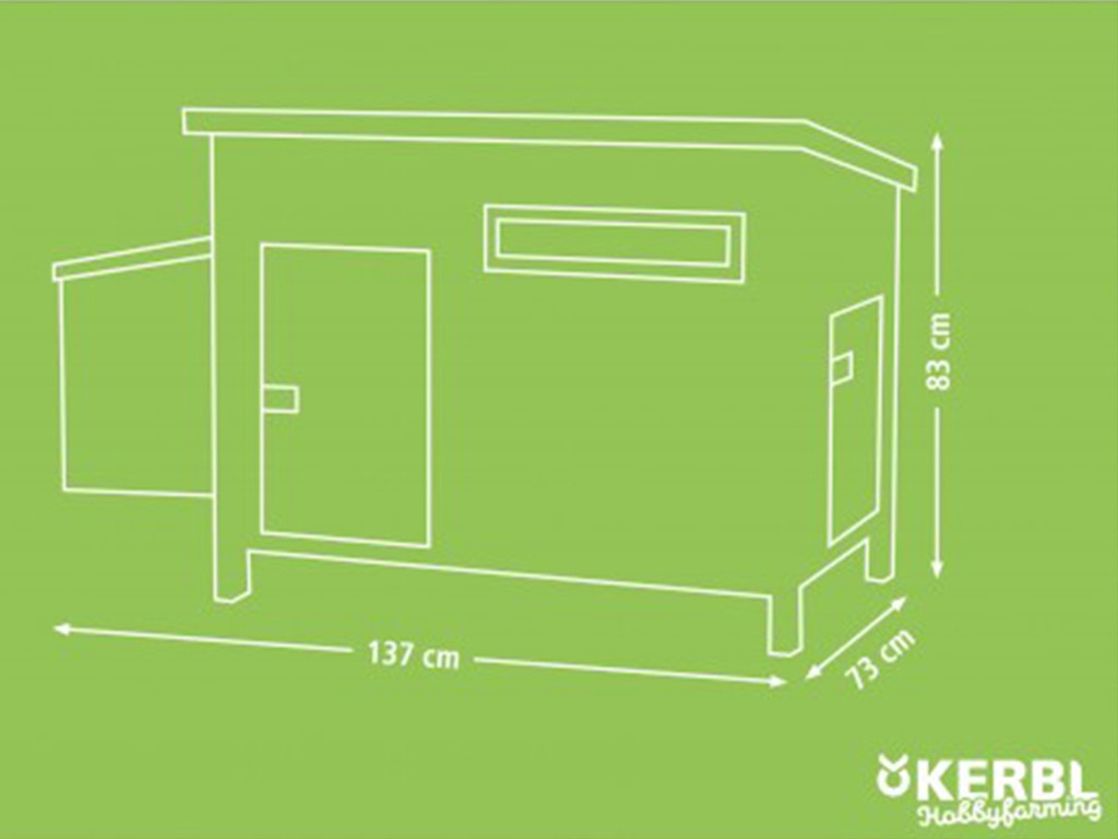 Wymiary zewnętrzne całego kurnika wynoszą 137x73x83 cm , i tym samym zapewnia komfort dla maksymalnie 6 klasycznych kur niosek. Wymiary drzwi przednich: 41 x 23 cm, drzwi bocznych: 34 x 26 cm (wys. x szer.).