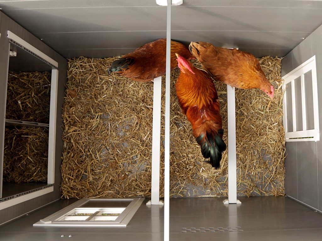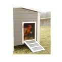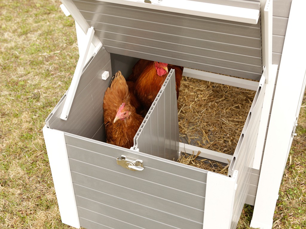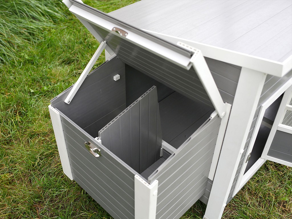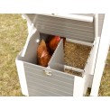 Kurnik wykonany z tworzywa ECO jest bardzo łatwy w utrzymaniu i czyszczeniu. Gładka struktura materiału zapewnia również odporność na ataki pasożytów, roztoczy i trzmieli. Czyszczenie kurnika ułatwia otwierany dach z blokadą.