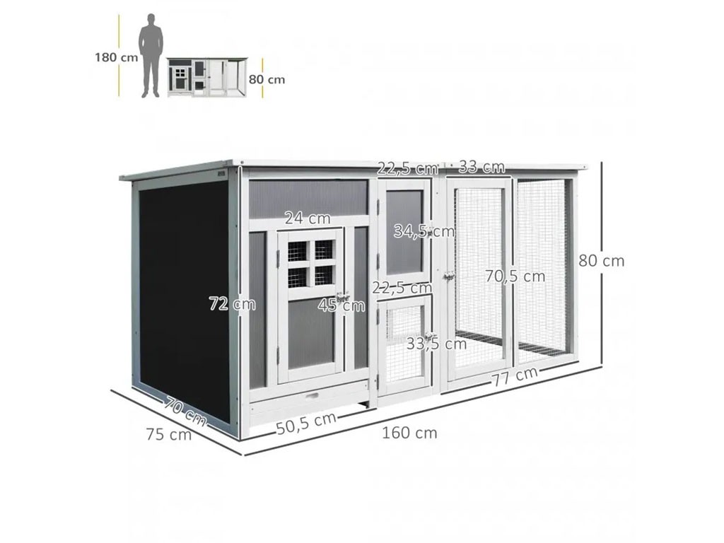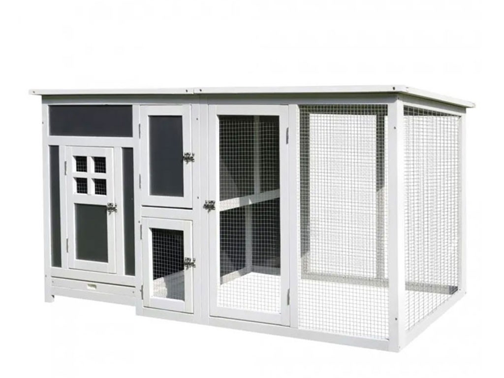Drewniany kurnik dla 1-2 kur , wykonany z drewna jodłowego , zamykane drzwi , uchylny, wodoodporny dach , dwukomorowe gniazdo do niosek , drzwi drewniane i druciane, wysuwana tacka na odchody , wymiary 160x80x75 cm.