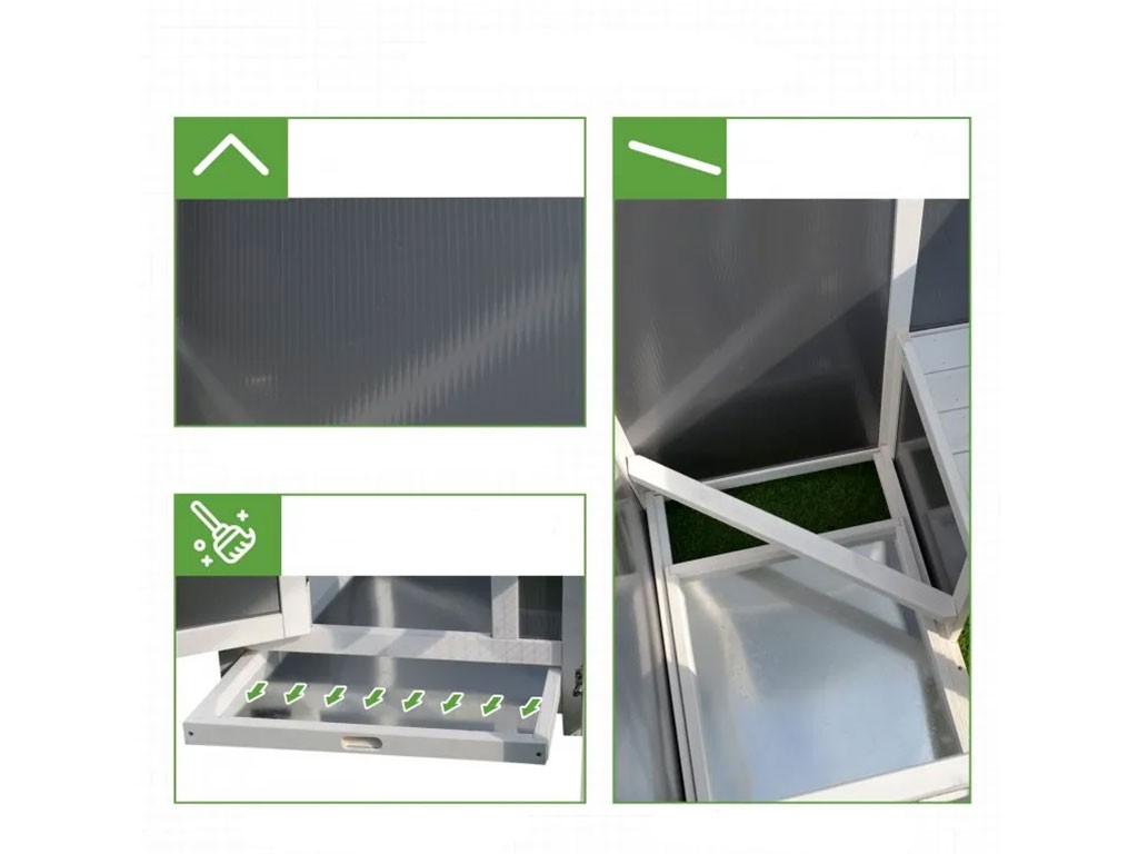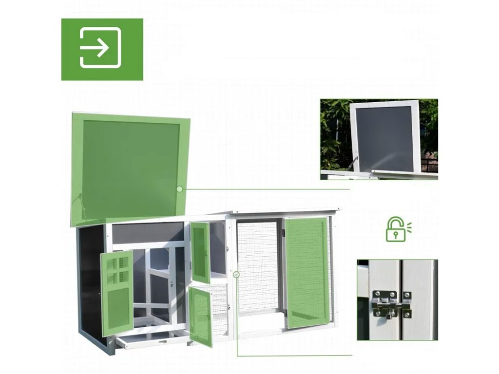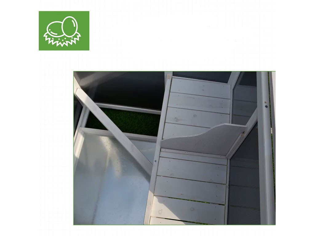 Kurnik z drewna jodłowego praktycznie nie wymaga konserwacji . Aby przedłużyć jego żywotność, powłokę ochronną należy odnawiać, jak w przypadku każdego drewna. Dzięki drzwiom kurnik można jednak szybko wyczyścić . Posiada również wysuwaną tackę na obornik , którą można po prostu wysunąć i wyczyścić.