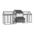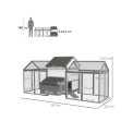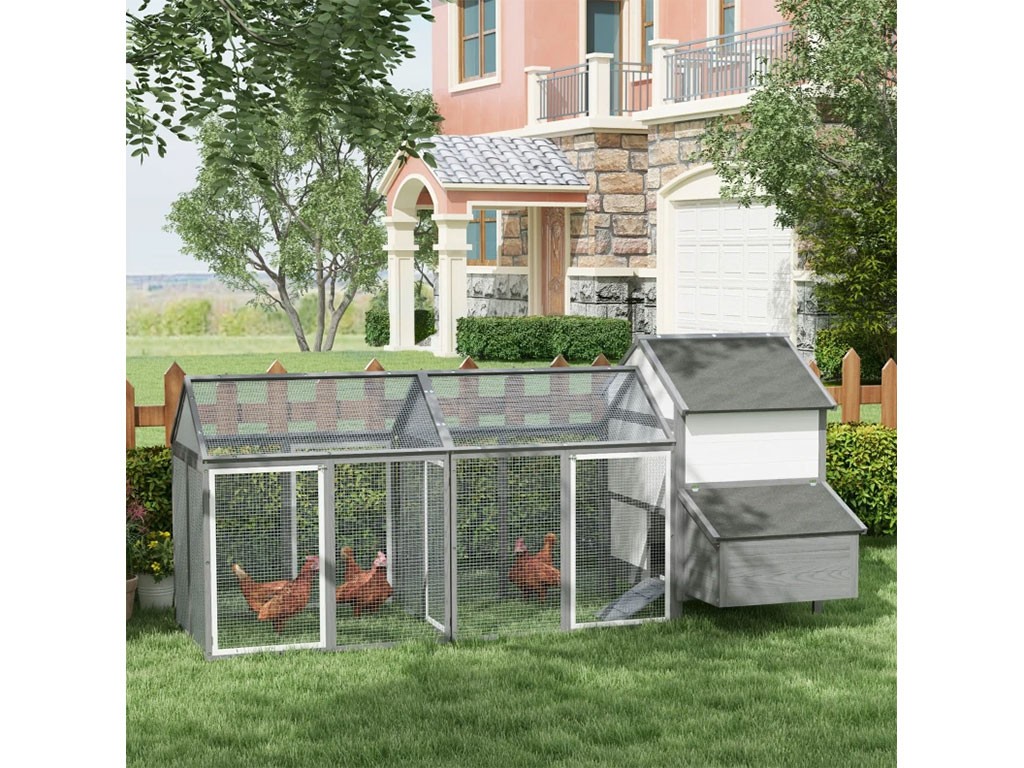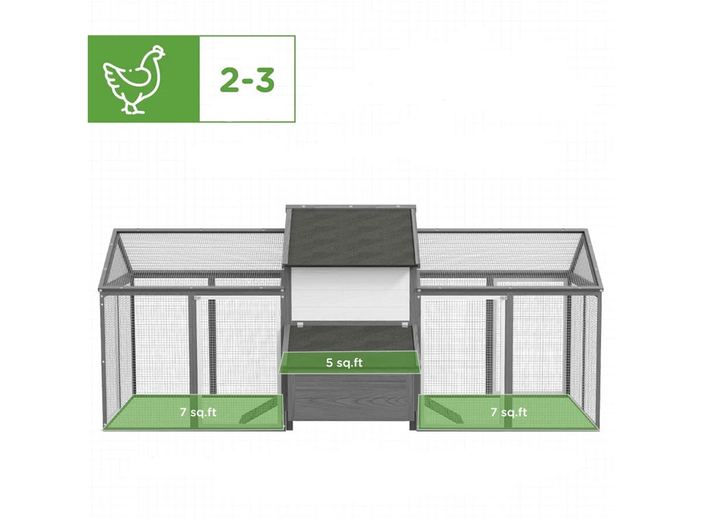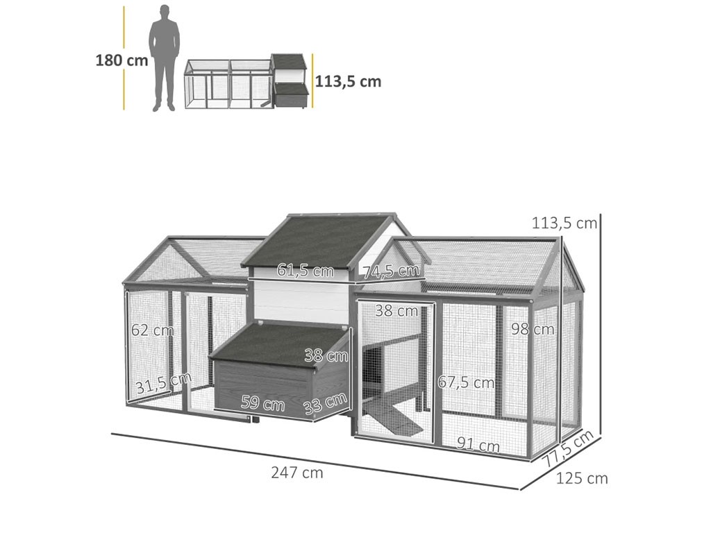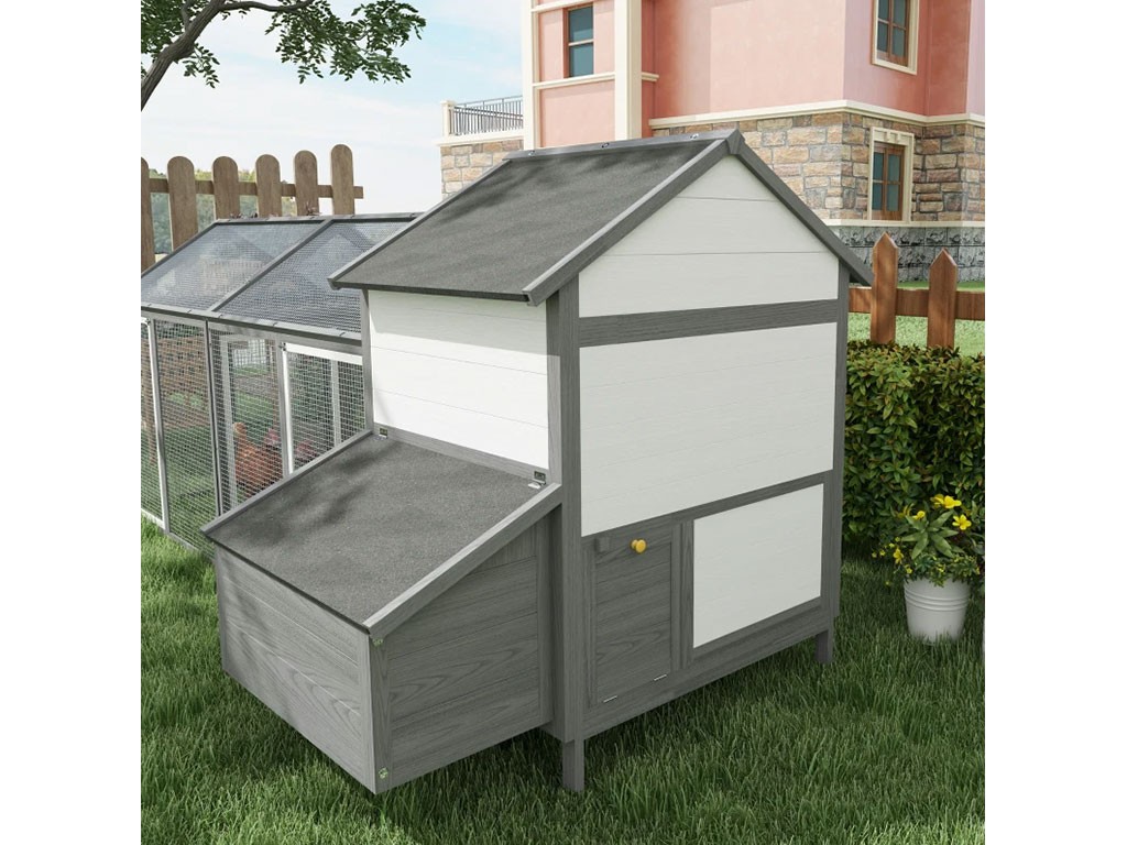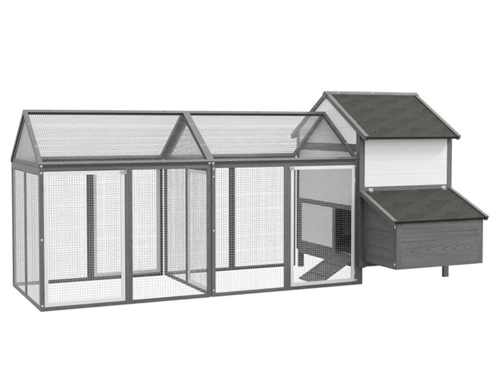 Drewniany kurnik dla 2-3 kur, wykonany z drewna jodłowego, podwójny wybieg, dach z papy, zewnętrzne gniazdo do niosek, drzwi drewniano-drutowe, wysuwana tacka na obornik, wymiary 247x125x113,5 cm.
