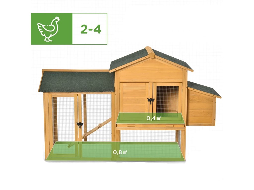 Drewniany kurnik dla 2-4 kur , wykonany z drewna jodłowego , drzwi zamykane na klucz , uchylny, dach asfaltowy , 1 zewnętrzne gniazdo niosek , drzwi drewniano-drutowe , wysuwana tacka na obornik , wymiary 168x103x75 cm.