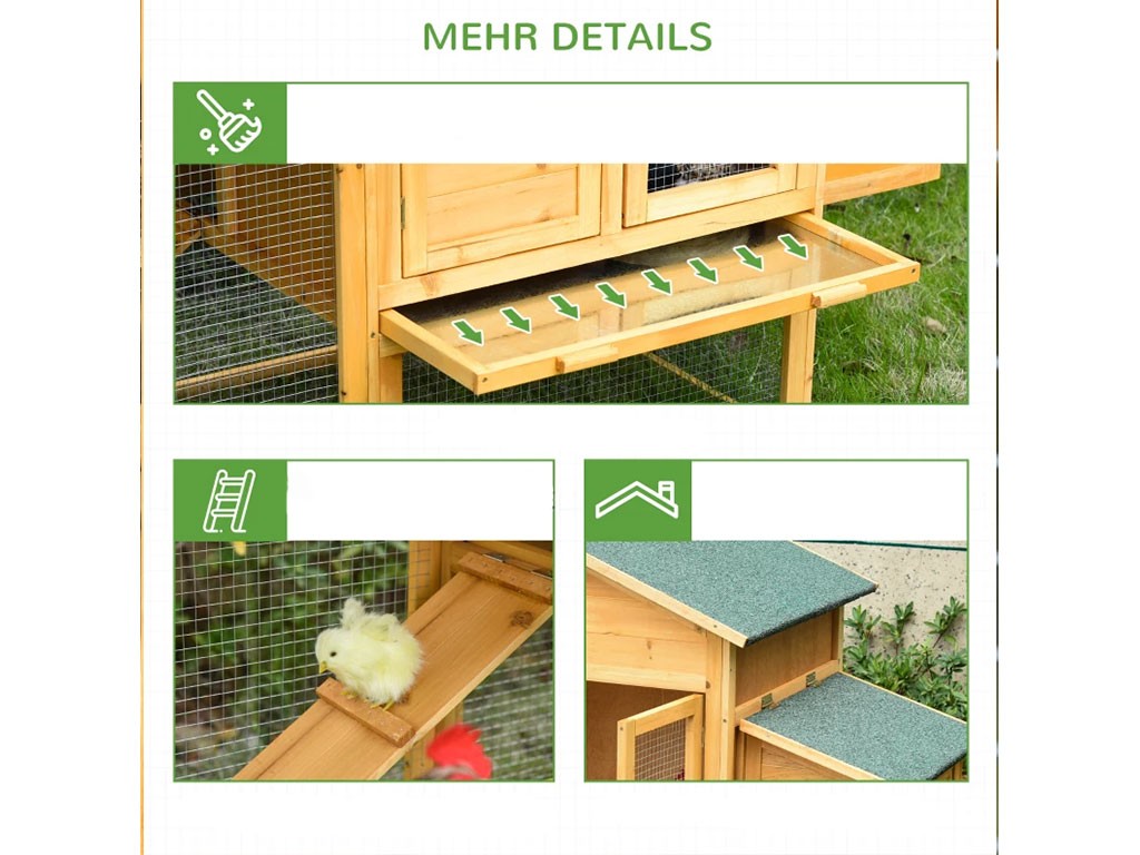Kurnik z drewna jodłowego praktycznie nie wymaga konserwacji . Aby przedłużyć jego żywotność, powłokę ochronną należy odnawiać, jak w przypadku każdego drewna. Dzięki drzwiom kurnik można jednak szybko wyczyścić . Posiada również wysuwaną tackę na obornik , którą można po prostu wysunąć i wyczyścić.
