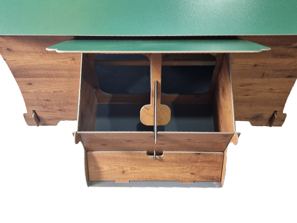 Kurnik dla kur, do hodowli 24-28 kur , wykonany z wysokiej jakości laminatu HPL , 4 zewnętrzne gniazda niosek , 4 grzędy, dach uchylny, wymiary 155x140x125 cm.