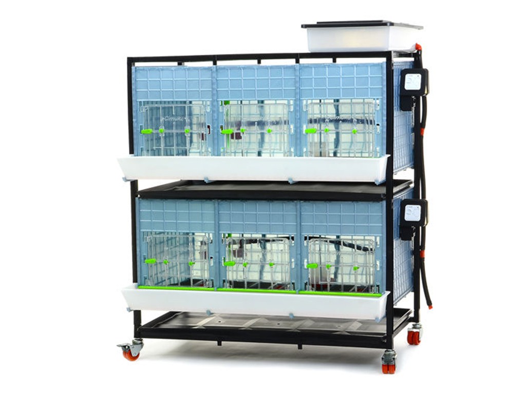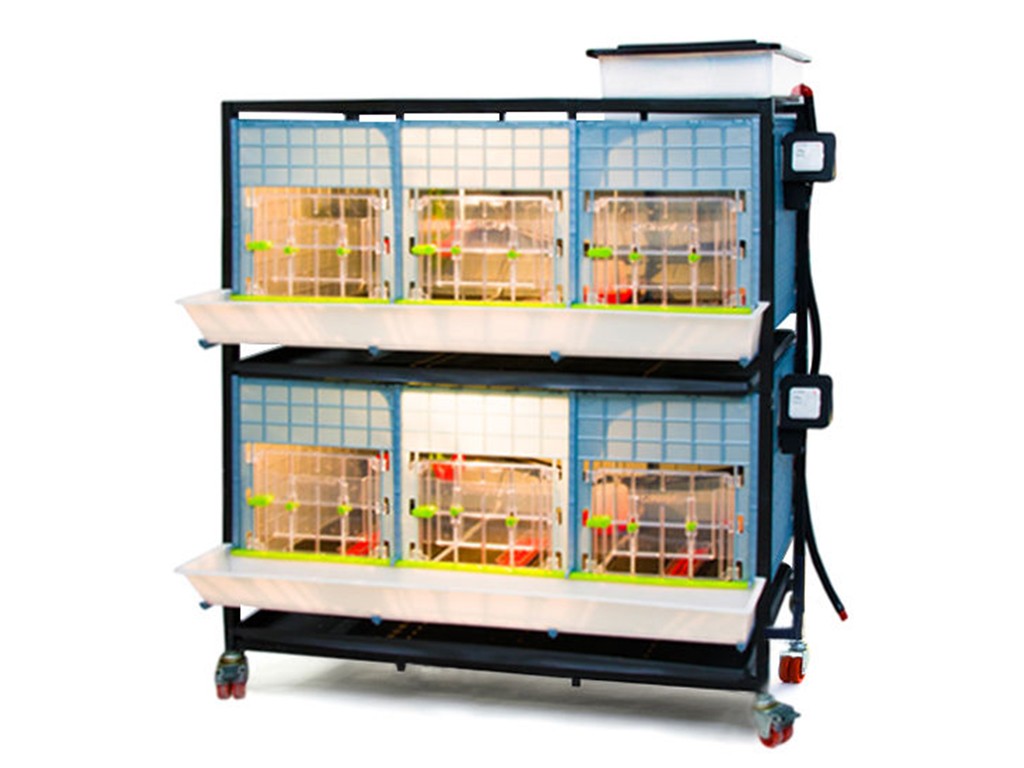Wymiary złożonej dwupiętrowej hodowli, wliczając koła, zbiornik na wodę, elementy grzewcze i karmniki, wynoszą 104 x 64 x 119 cm .