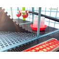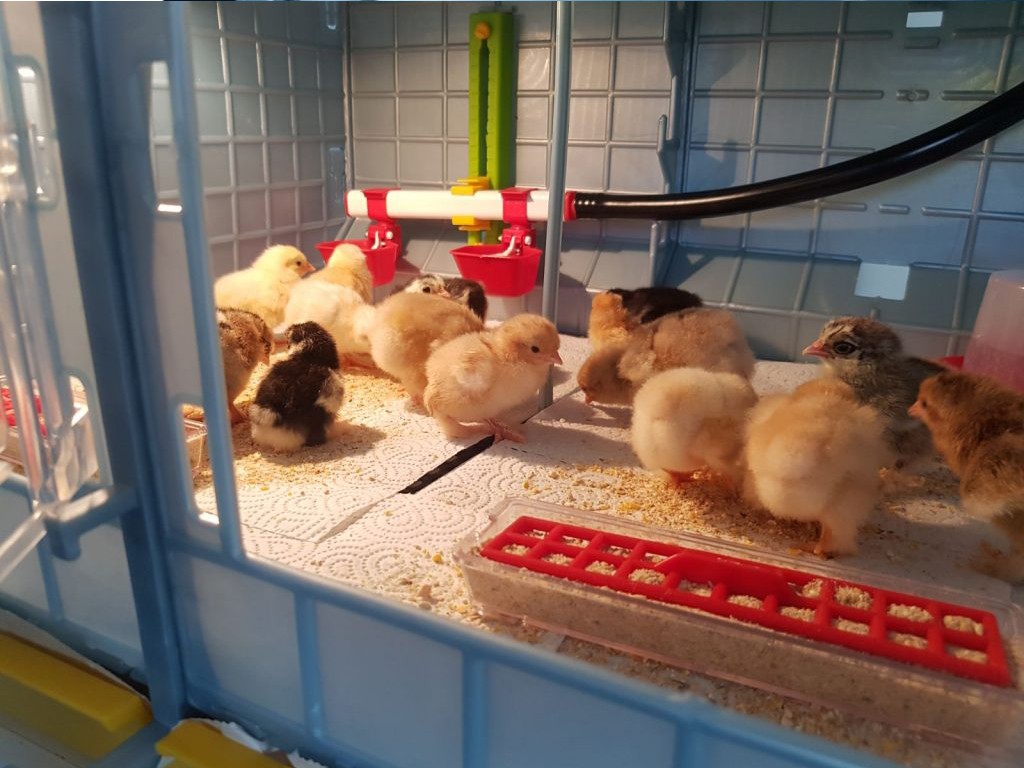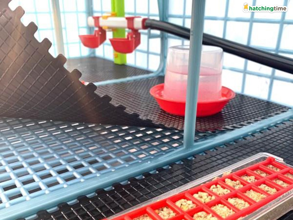 W zestawie na każdym piętrze znajdują się trzy przenośne miski do karmienia piskląt na pierwsze dni życia , a kurnik jest również wyposażony w wiszący karmnik o dużej pojemności, zapewniający zapas karmy na nawet 2 dni dla każdego pisklęcia. Karmniki wykonane są z wysokiej jakości tworzywa sztucznego, odpornego na uderzenia i bardzo łatwego w utrzymaniu . Dodatkowo karmniki wyposażone są w specjalną kratkę , która zapobiega rozgrzebywaniu karmy przez pisklęta, zapobiegając tym samym jej marnowaniu . Kratka została zaprojektowana z myślą o zachowaniu odpowiedniej swobody ruchu podczas pobierania karmy.