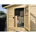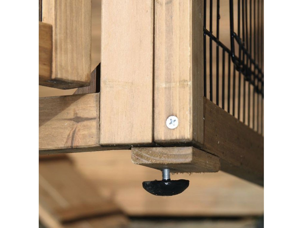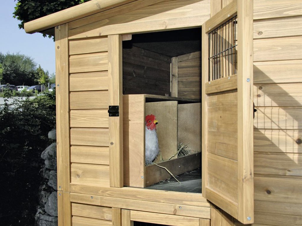 Drewniany kurnik waży około 120 kg, co zapewnia dużą stabilność . Aby zapewnić suchość konstrukcji, kurnik stoi na czterech podniesionych nogach. Kurnik nie jest ocieplony. Aby chronić kurnik przed słońcem, dach kurnika i gniazd niosek pokryto papą bitumiczną . Zalecamy jednak umieszczenie kurnika pod zadaszeniem , aby chronić go przed deszczem, śniegiem i intensywnym nasłonecznieniem. Drewniany kurnik jest zabezpieczony podstawową powłoką ochronną. Aby przedłużyć jego żywotność, powłokę ochronną należy regularnie odnawiać, tak jak w przypadku każdego drewna. Obieg powietrza w kurniku zapewniają dwoje drzwi wejściowych z okienkami z siatki .
