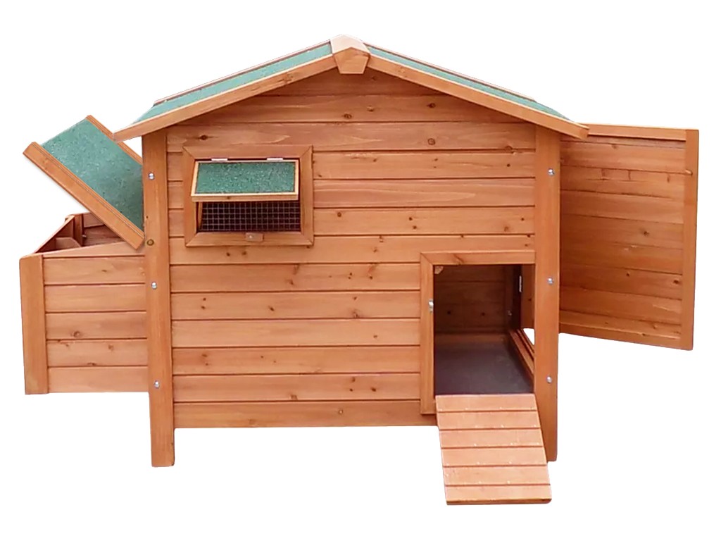 Kurnik wykonany z drewna sosnowego waży około 40 kg, co zapewnia dużą stabilność . Aby zapewnić wentylację podłogi, kurnik stoi na czterech podniesionych nogach. Kurnik nie jest ocieplony. Aby chronić przed słońcem, dach kurnika i gniazda niosek pokryto papą . Zalecamy jednak umieszczenie kurnika pod zadaszeniem, aby chronić go przed deszczem, śniegiem i intensywnym nasłonecznieniem. Drewniany kurnik jest zabezpieczony podstawową powłoką ochronną. Aby przedłużyć jego żywotność, powłokę ochronną należy odnawiać, tak jak w przypadku każdego drewna. Obieg powietrza w kurniku zapewnia uchylne okno z przodu .