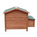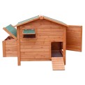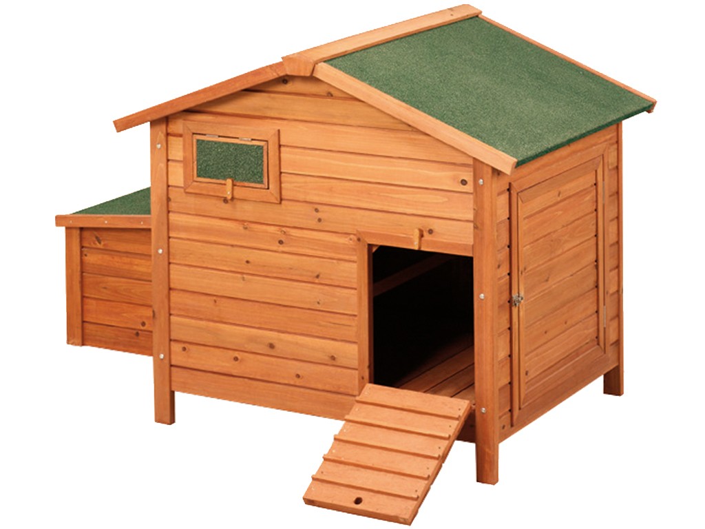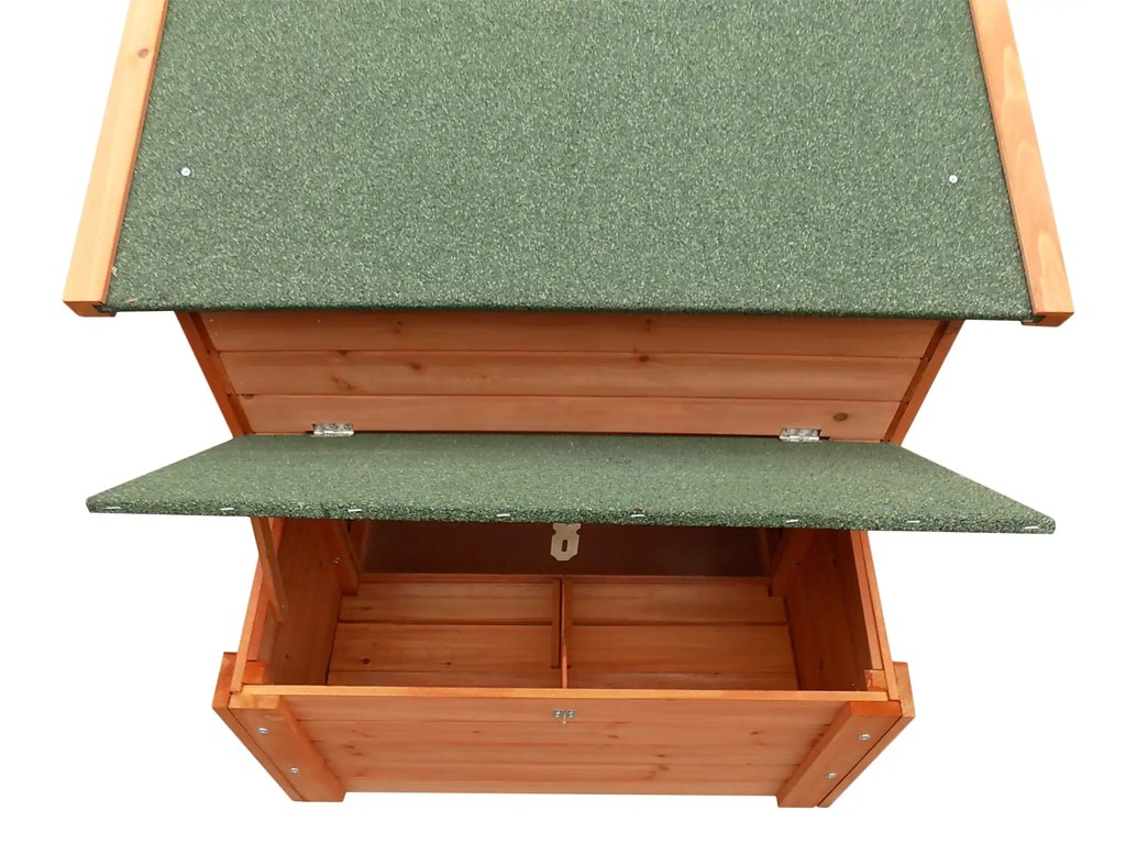 Drewniany kurnik dla 4-6 kur niosek, wykonany z drewna sosnowego, wodoodporny dach, przestronne drzwi boczne, wyjmowane dno ułatwiające czyszczenie, 2 wodoodporne gniazda dla kur niosek, zamykana rampa wejściowa, okno wentylacyjne, grzędy, wymiary 1115x900x900 mm.