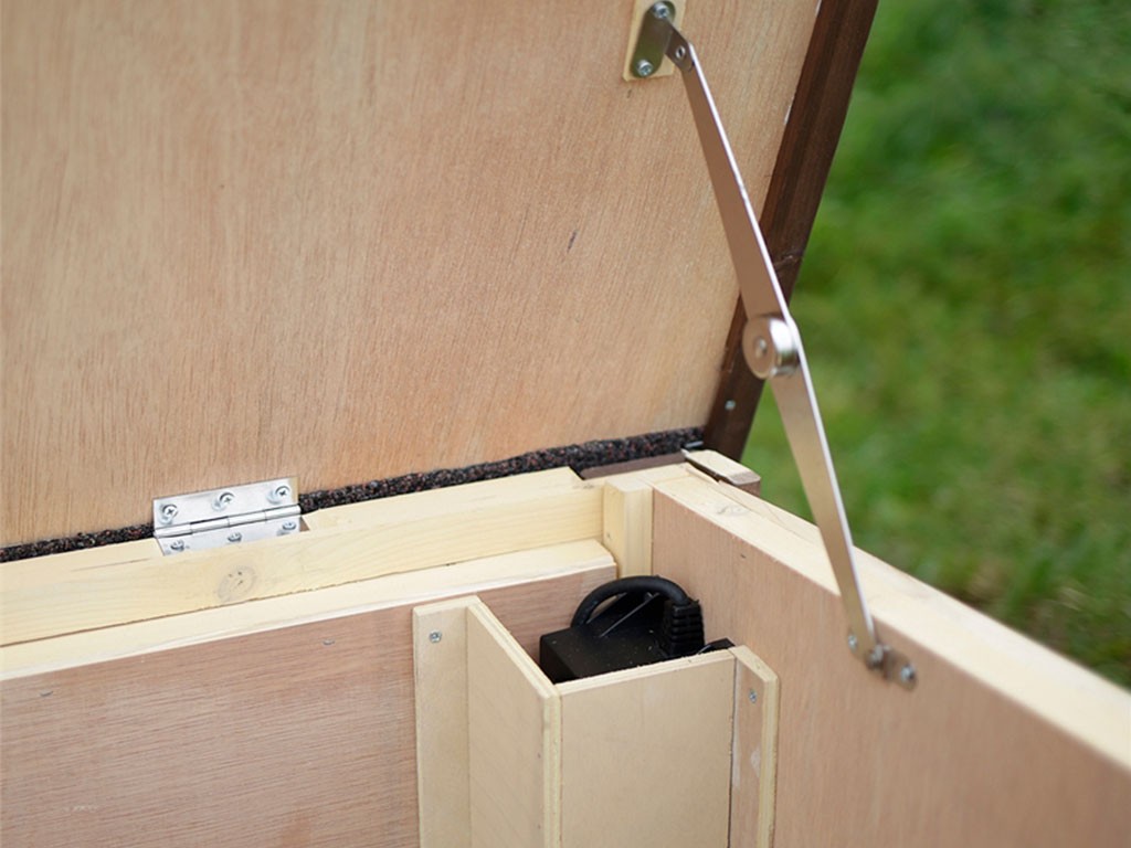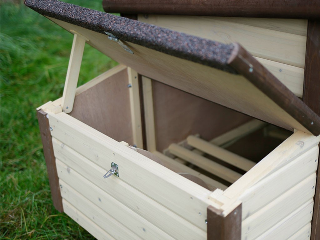 Czyszczenie kurnika jest niezwykle proste. Możesz łatwo otworzyć dach kurnika i upewnić się , że pozostanie on otwarty tak długo, jak potrzebujesz. Kurnik posiada ocynkowane dno , które jest nie tylko łatwe w czyszczeniu, ale również nie nasiąka wodą i nie zatrzymuje zapachów. Można je zatem łatwo umyć wodą. Konserwacja elementu grzejnego odbywa się po odłączeniu urządzenia od sieci i polega na usunięciu zanieczyszczeń czystą, suchą lub lekko wilgotną szmatką.