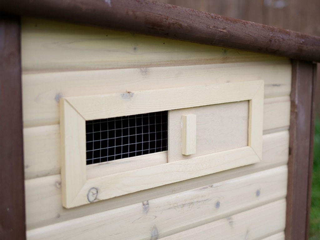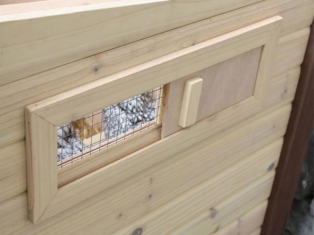 Kurnik ma dwa wejścia. Większe wejście posiada drzwi na zawiasach , które służą jako rampa ułatwiająca wchodzenie i wychodzenie z kurnika. Drzwi posiadają dwa zamki zabezpieczające przed drapieżnikami. Mniejsze drzwi posiadają zamek i okienko do oświetlenia wnętrza. Z boku kurnika znajduje się przesuwane okno , które zapewnia cyrkulację powietrza.