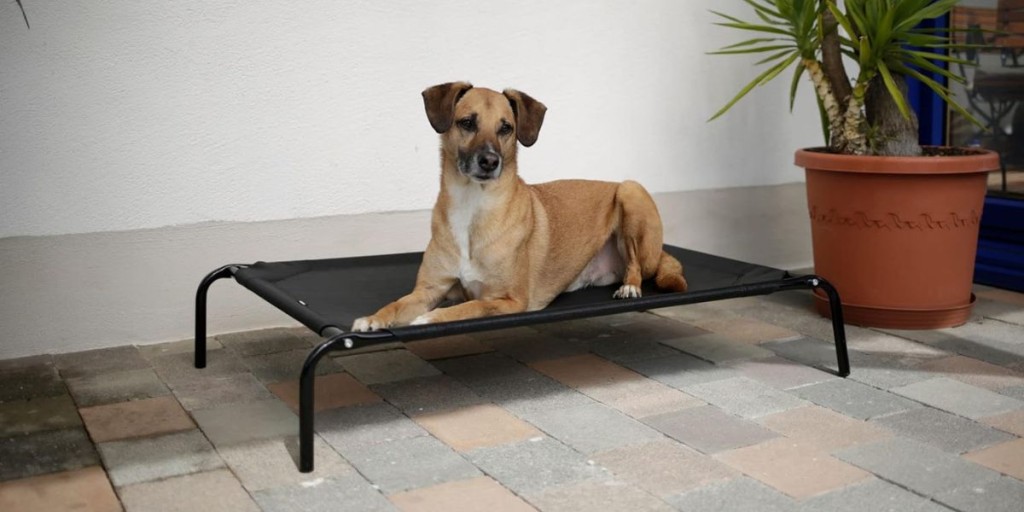 Legowisko dla psa, do użytku wewnątrz i na zewnątrz, praktyczne w domu i w podróży, malowana metalowa rama, trwałe, oddychające pokrycie, odporne na promieniowanie UV, hydrofobowe, nośność legowiska do 25 kg, wymiary 107x65x20cm.