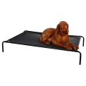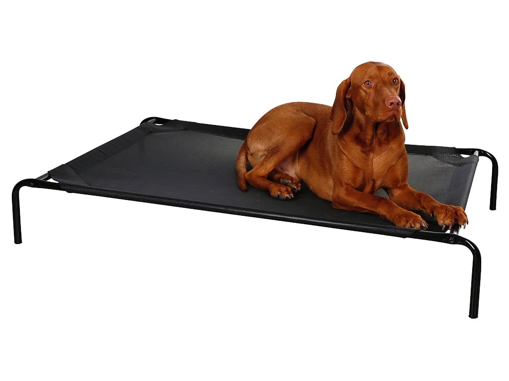 Legowisko dla psa, do użytku wewnątrz i na zewnątrz, praktyczne w domu i w podróży, malowana metalowa rama, trwałe, oddychające pokrycie, odporne na promieniowanie UV, hydrofobowe, nośność legowiska do 35 kg, wymiary 130x80x20 cm.