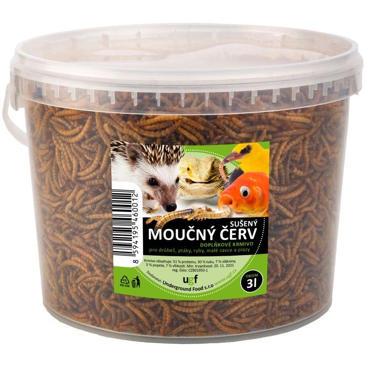 Suszone larwy mącznika młynarka są w 100% naturalnym pokarmem uzupełniającym dla ptaków, ryb, jaszczurek, legwanów, żółwi, żab, jeży, chomików, myszy, szczurów i innych małych ssaków, kotów i psów.