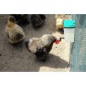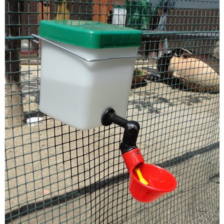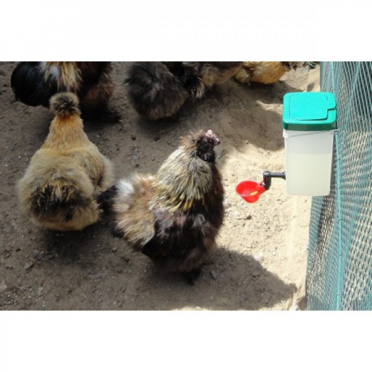 Poidło z czerwoną misą i uchwytem z siatki. Odpowiednie dla drobiu.