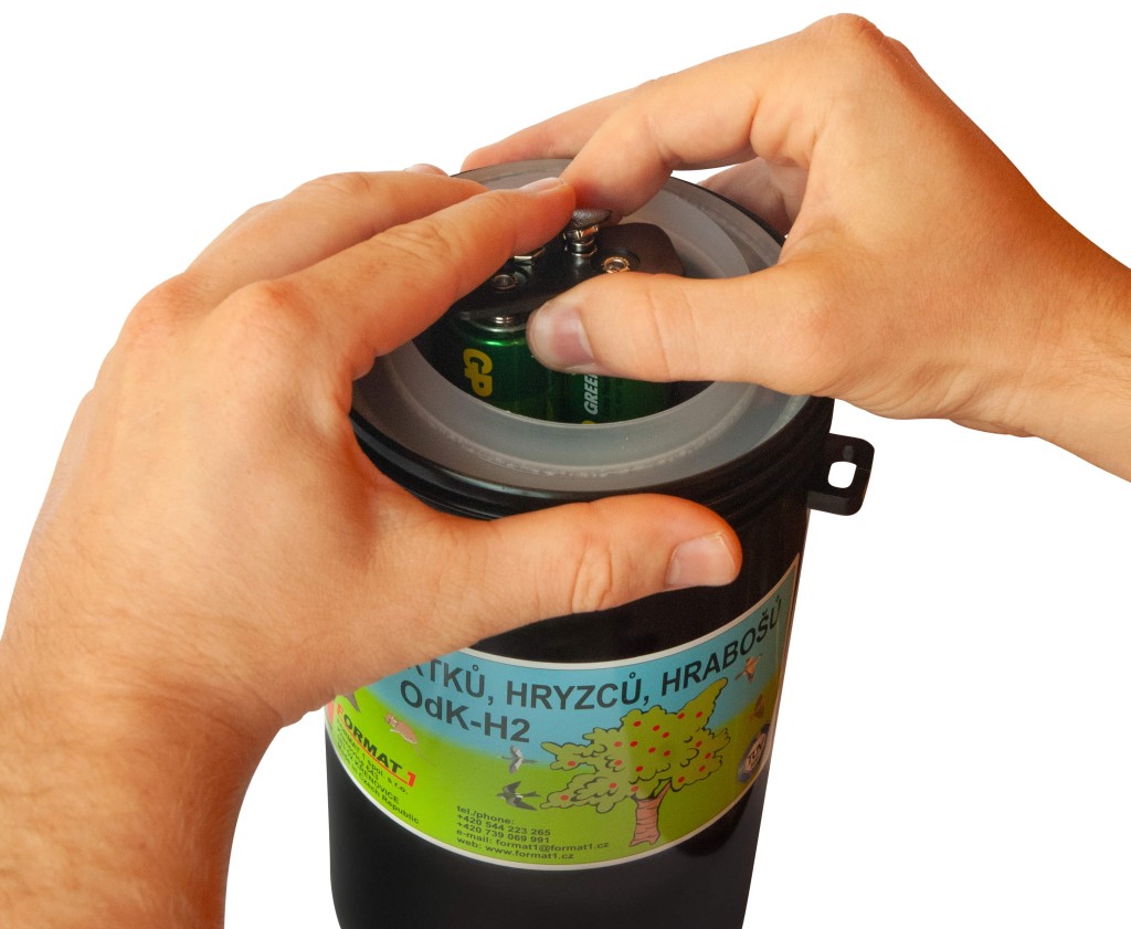 Moc dźwięku jest intensywna i ma duży zasięg. Dlatego urządzenie jest zasilane 6 bateriami serii „C”, które wystarczają na cały sezon (około 6 miesięcy). Ze względu na wymaganą wysoką moc akustyczną, strach na wróble OdK-H2 zasilamy bateriami, a nie ogniwami słonecznymi, które nie byłyby w stanie dostarczyć niezbędnej mocy przy tych rozmiarach.