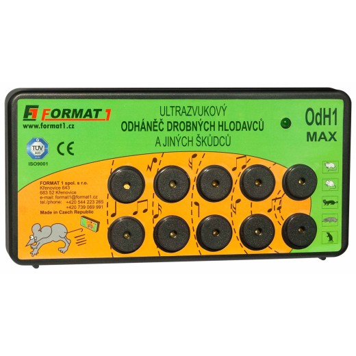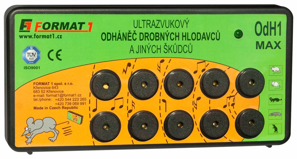 Elektroniczny odstraszacz myszy, kun, szczurów, łasic i łasic dźwiękowo-ultradźwiękowy. To produkt w pełni czeski, z długą tradycją na rynku (od 1991 roku), produkowany bezpośrednio w naszej firmie FORMAT1 spol. s ro. Niezawodny, wydajny, sprawdzony przez wielu klientów od ponad 29 lat. Odstraszacz kun jest nieszkodliwy zarówno dla ludzi, jak i zwierząt gospodarskich.Odstraszacz tworzy nieprzyjemne środowisko dźwiękowe dla szkodników (w zakresie dźwięków słyszalnych i ultradźwięków), które stopniowo opuszczają obszar chroniony. Odstraszacz jest zatem całkowicie humanitarny – nie zabija zwierząt, nie robi im krzywdy, a jedynie utrudnia im przebywanie w obszarze chronionym, czyli je odstrasza. Nie zawiera żadnych dodatków chemicznych.