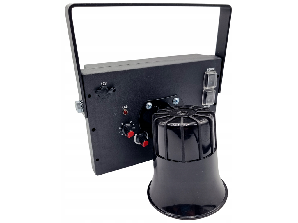 Odstraszacz ptaków dźwiękowy , zasilany zasilaczem 12 V , odpowiedni do odstraszania szpaków, wróbli itp., stopień ochrony IP54 - wodoodporny, pyłoszczelny, do stosowania na zewnątrz, w sadach, winnicach, 1 głośnik membranowy, zasięg do 6000 m2, czas trwania sygnału dźwiękowego 38 s, regulowana głośność, regulowane interwały odstraszania, z radarem ruchu PIR, wykrywa ruch do 12 m, kąt detekcji radarowej 360°, czujnik zmierzchowy, niskie zużycie prądu 26 mA, z zabezpieczonymi przełącznikami, do montażu za pomocą śrub za pomocą uchwytu, wymiary 225 x 160 mm.