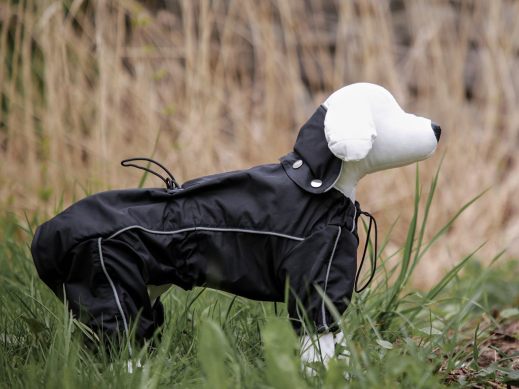 Płaszcz przeciwdeszczowy dla psa, odporny na deszcz i wiatr, ze ściągaczem, odpinany kołnierz, chroni aż po każdą łapę, z odblaskową lamówką, obwód szyi 36 cm, obwód brzucha 40 cm, długość ciała 30 cm, długość nogawki 23 cm.