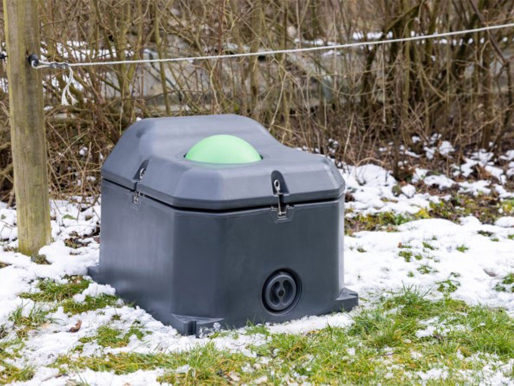Poidło kulowe dla bydła i koni, jednostanowiskowe o pojemności 40 litrów, dla 10-15 zwierząt, mrozoodporne z podwójną izolacją, temperatura wody zimą ok. 3-5°C, temperatura wody latem ok. 10-12°C, otwór odpływowy Ø100 mm, nie wymaga podłączenia do sieci elektrycznej, wymiary 60x70x52,5 cm.