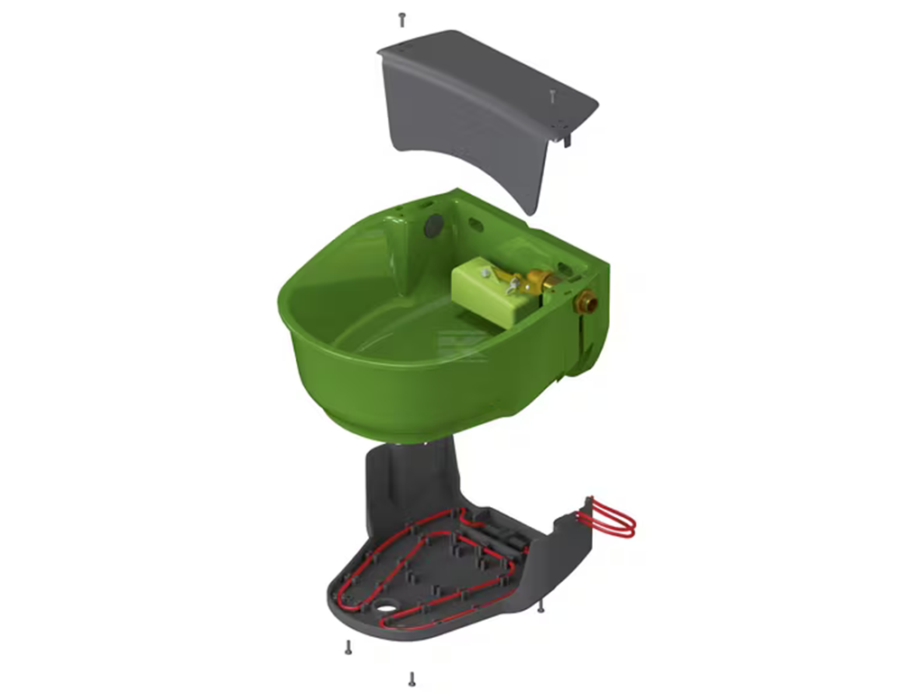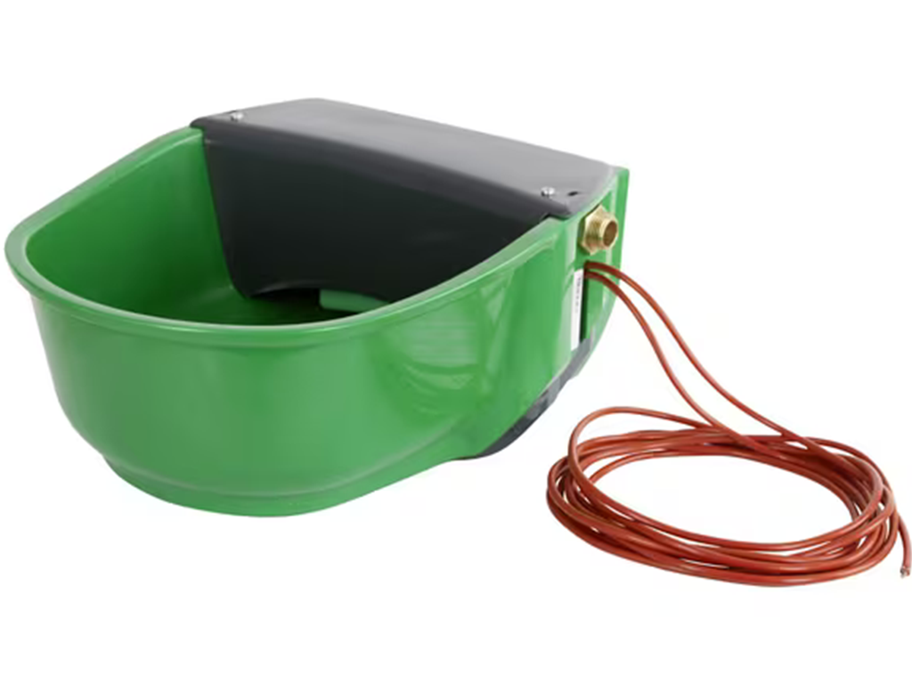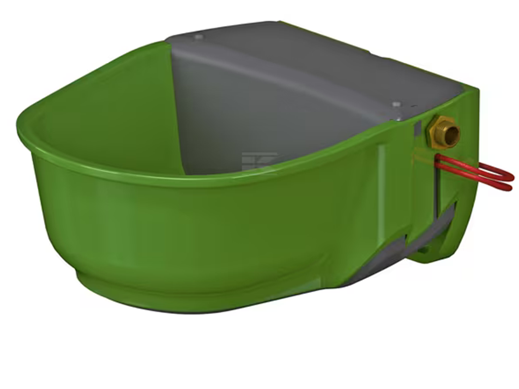Poidło podgrzewane z kablem grzewczym dla koni, owiec i bydła, wykonane z wysokiej jakości, trwałego tworzywa sztucznego, zintegrowany termostat, odporne na zamarzanie do -15°C, do montażu na ścianie lub rurze, pojemność 5 litrów, wymiary 29,5x34x16,1 cm.