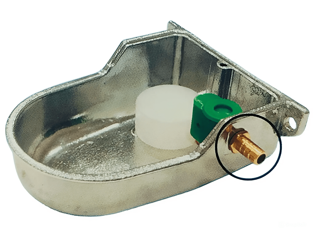 Poidło poziome dla małych zwierząt, utrzymuje stały poziom, do podłączenia do zbiornika, wykonane z aluminium, pojemność 0,4 l, wymiary 14,5x16x6 cm.