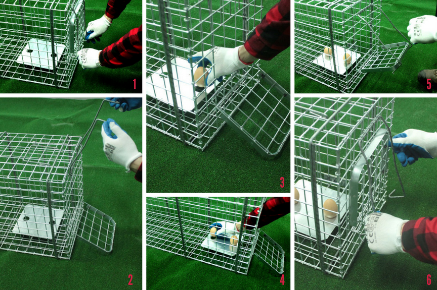 - Przynętę umieszcza się na drugim końcu pułapki, od wejścia do klatki pułapkowej.