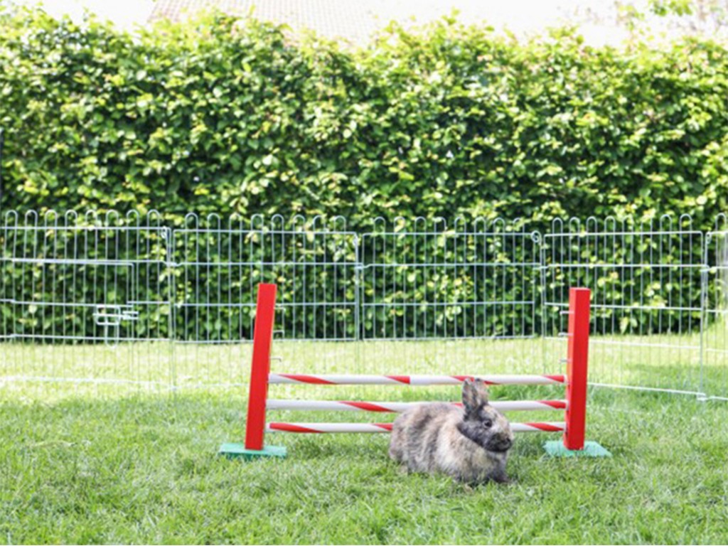 Przeszkoda dla królików , świnek morskich i innych gryzoni do treningu agility lub skakania . Regulowana wysokość przeszkody 5-30 cm, szerokość przeszkody 62 cm, dwa drewniane słupki i 5 plastikowych drążków, możliwość ustawienia drążków poziomo lub poprzecznie .