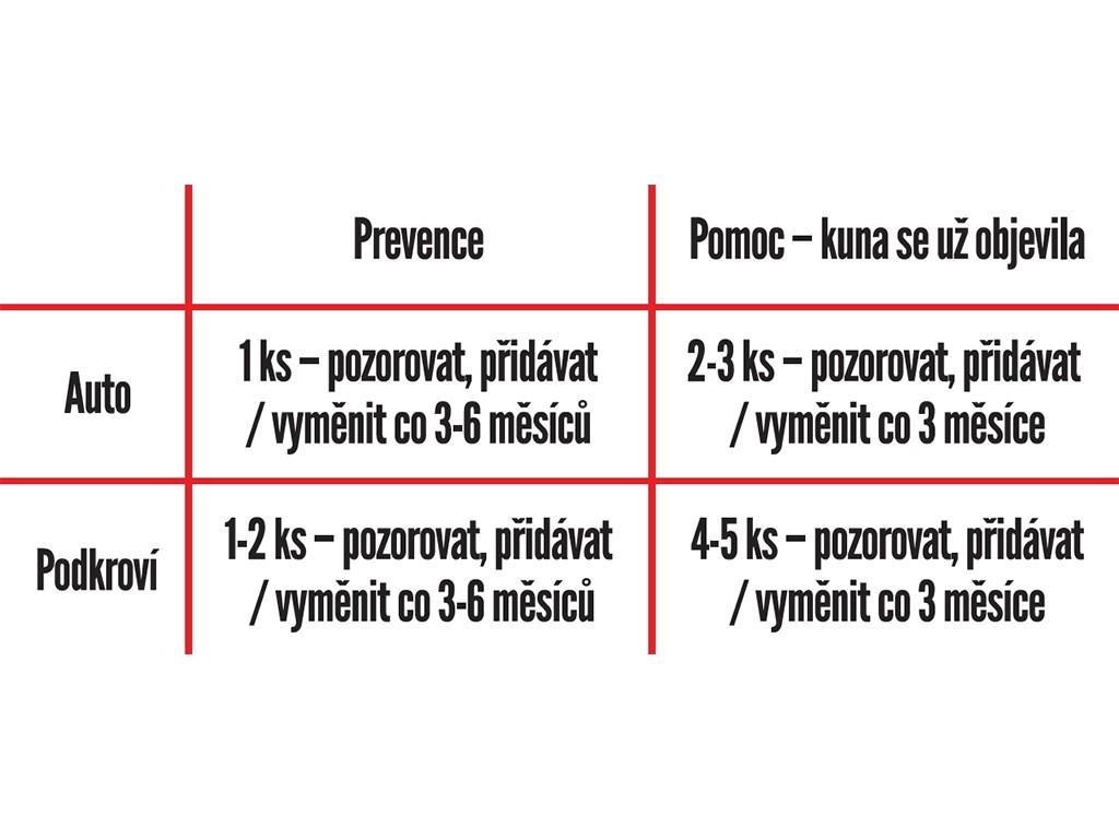 Odstraszacz można stosować w samochodzie , gdy zauważymy już obecność kun (pogryzione kable, izolacja itp.) lub jako środek zapobiegający przedostawaniu się kun pod maskę samochodu. Można go również stosować na strychu, w piwnicy, w kurniku lub wszędzie tam, gdzie znaleziono ślady kun lub jako środek zapobiegawczy przed przedostawaniem się kun .