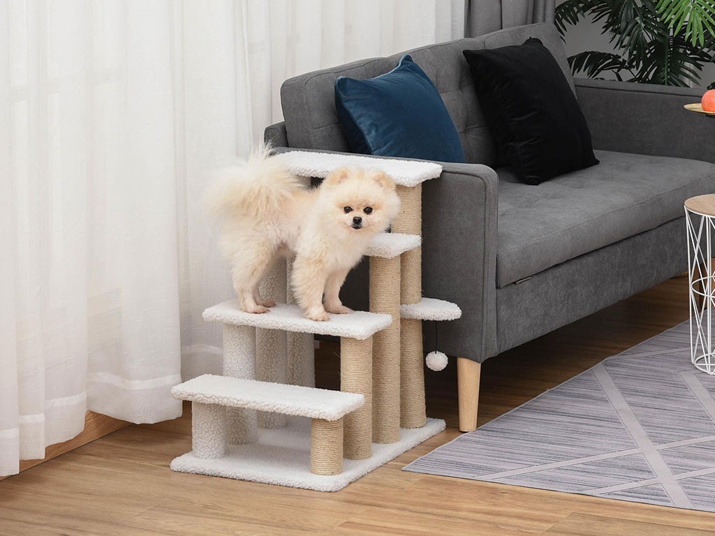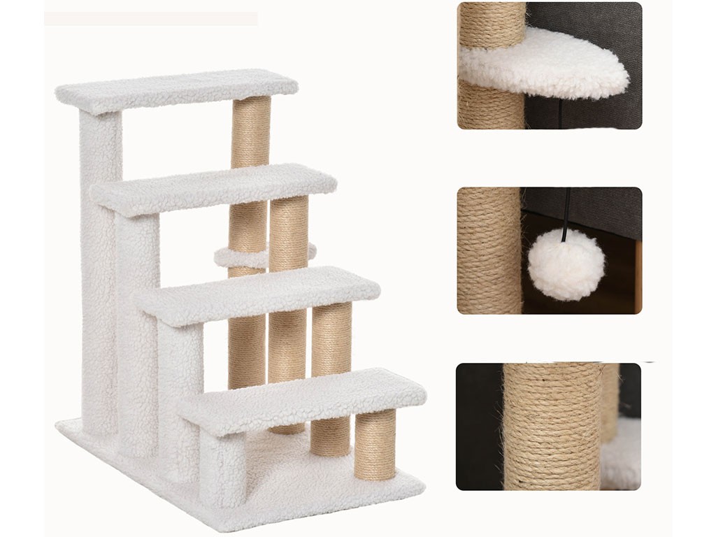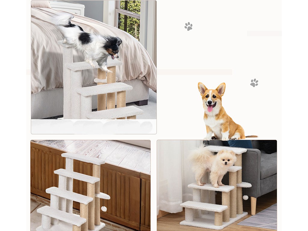 Schody dla psów i kotów, czterostopniowe, łatwe do pokonywania , wyłożone miękkim pluszem, z trwałym drapakiem i miękką piłeczką, wymiary stopni 40x15 cm, wymiary całkowite 60x40x64 cm.