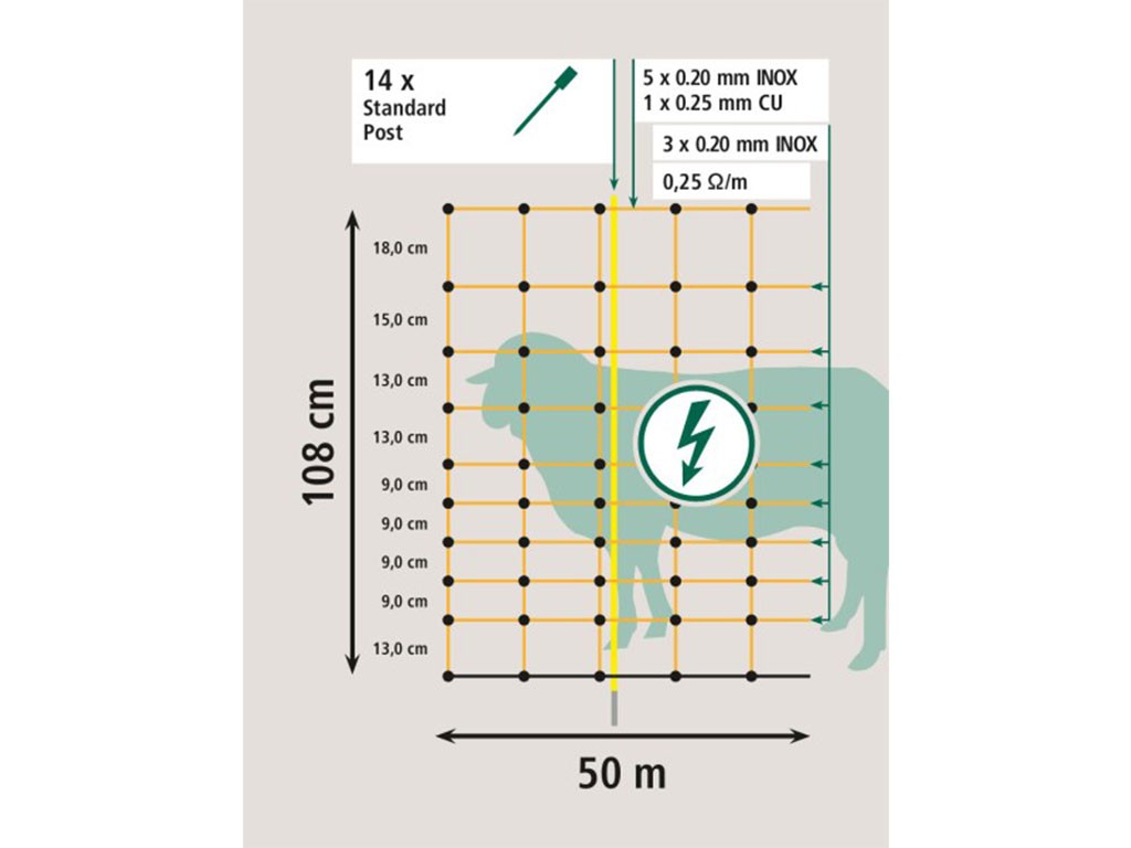 Siatka ogrodzeniowa przewodząca dla owiec, do budowy ogrodzeń elektrycznych, 10 poziomych linek, górna linka wzmocniona do 6 drutów, dolna linka bez drutu, pozostałe poziome linki z 3 drutami, 14 plastikowych prętów z 1 końcówką, solidnie zespawane połączenia i trwałe ograniczniki, wysokość 108 cm i długość 50 m.