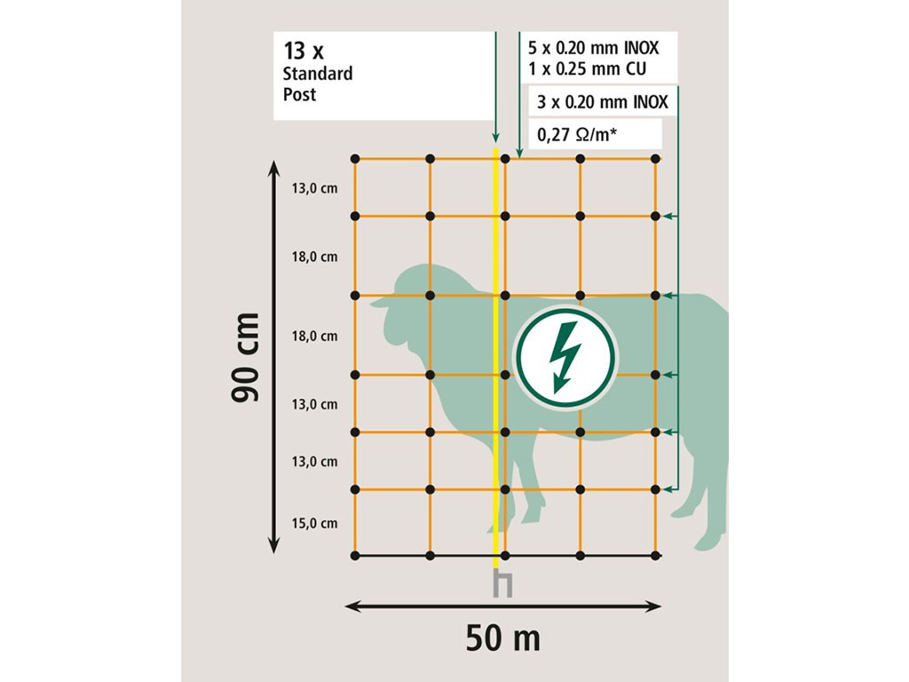 Siatka elektryczna dla owiec , 7 drutów poziomych, wzmocniona górna linka, solidne plastikowe pręty z 2 kolcami, wyjątkowo stabilne węzły spawane, połączenie drutów miedzianych i ze stali nierdzewnej, zwiększona przewodność, wysokość 90 cm , długość 50 m.