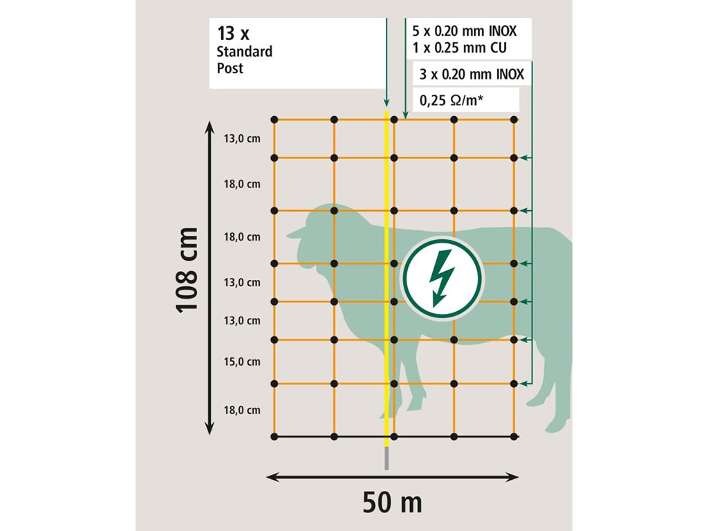 Siatka elektryczna dla owiec , 8 drutów poziomych, wzmocniona górna linka, solidne plastikowe pręty z 1 kolcem, wyjątkowo stabilne węzły spawane, połączenie drutów miedzianych i ze stali nierdzewnej, zwiększona przewodność, wysokość 108 cm i długość 50 m.