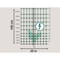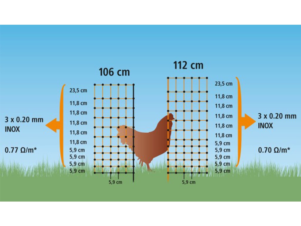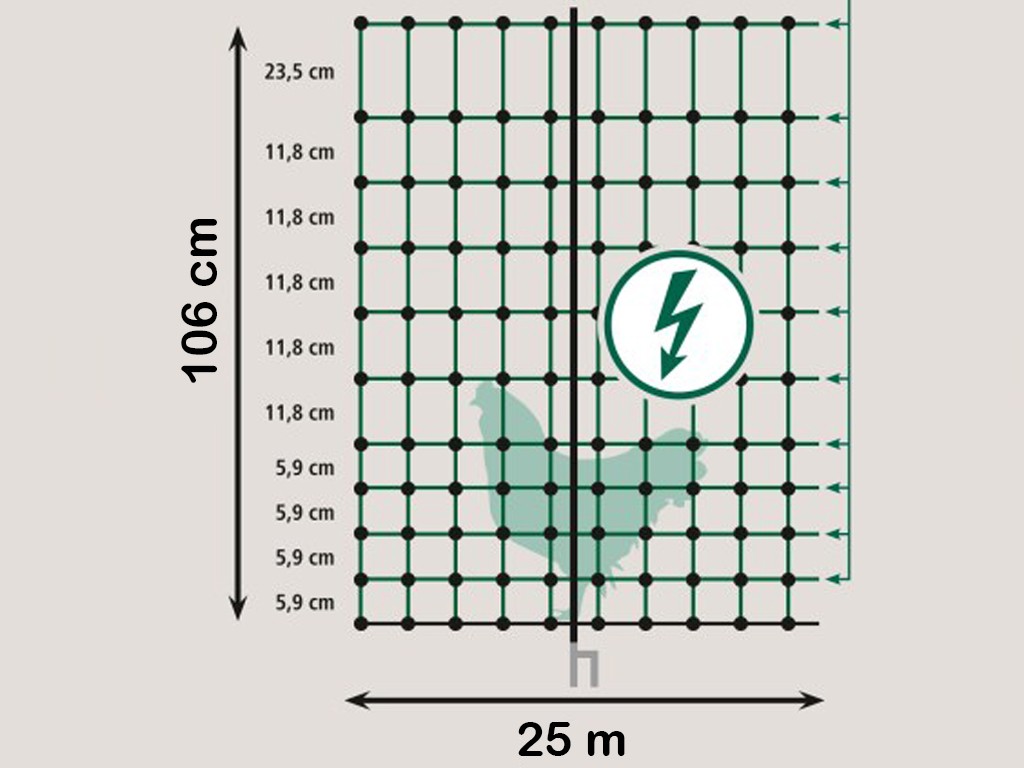 Siatka przewodząca dla drobiu o wysokości 106 cm i długości 50 m, przeznaczona do budowy ogrodzenia elektrycznego. Opakowanie zawiera 15 solidnych plastikowych prętów z podwójną końcówką i 4 haczykami kotwiącymi. Siatka ochronna, która zapobiega ucieczce kur lub jagniąt, a jednocześnie chroni je przed drapieżnikami .