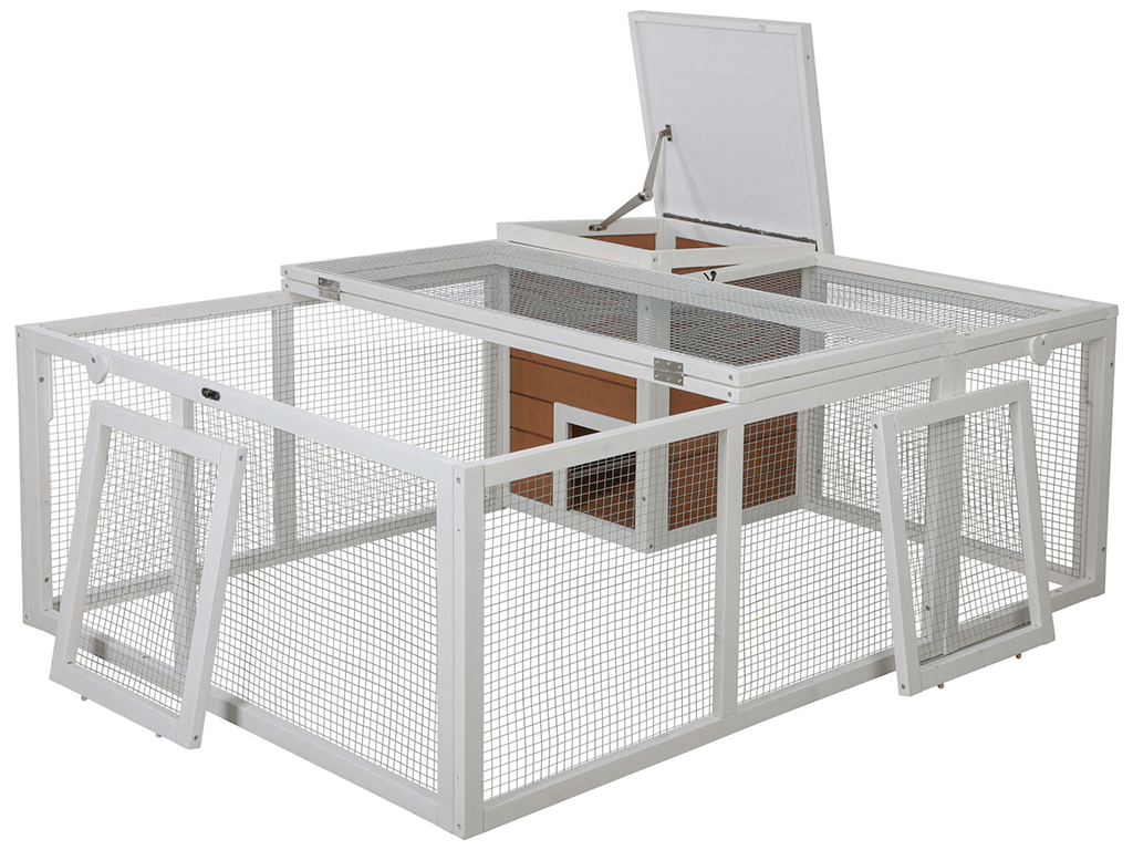 Wybieg dla królików z domkiem , wymiary 132x102x59 cm . Ten wybieg dla królików z domkiem zapewnia doskonałe schronienie dla Twoich pupili i ma wytrzymały dach, który chroni je przed niekorzystnymi warunkami pogodowymi. Górną część wybiegu można złożyć, aby ułatwić dostęp do wybiegu.