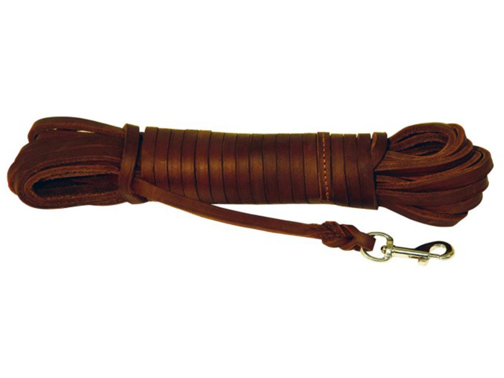 Smycz do tropienia dla psa , odpowiednia do tresury i tropienia, uszyta z jednego kawałka wysokiej jakości skóry , z solidną klamrą ze stali nierdzewnej , szerokość 8 mm, długość 10 m .