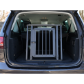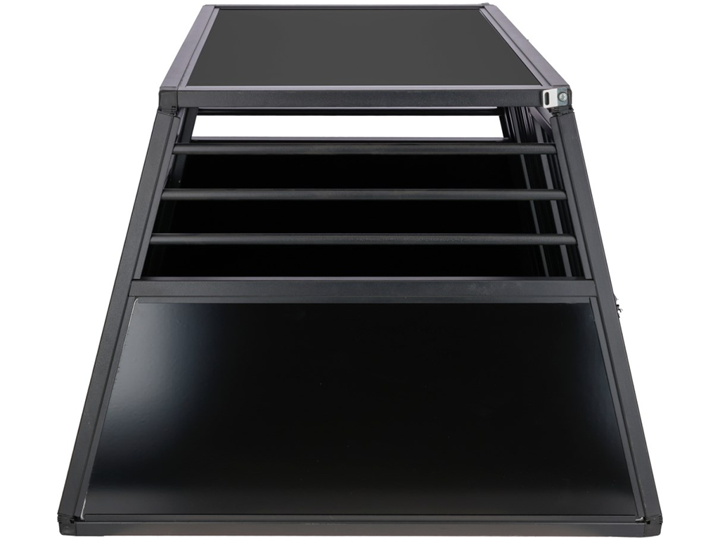 Klatka do transportu psa, mocna i bezpieczna aluminiowa skrzynia samochodowa, drzwi z systemem szybkiego zwalniania, dobra cyrkulacja powietrza i widoczność, podgrzewana wykładzina gumowa antypoślizgowa zapewniająca optymalne siedzenie, łatwa konserwacja i montaż, wymiary 77x55x50cm.